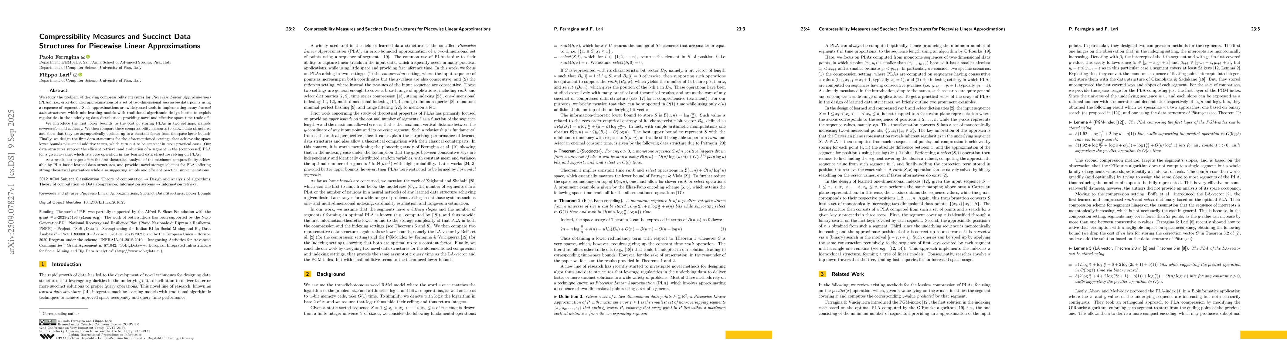 We study the problem of deriving compressibility measures for \emph{Piecewise Linear Approximations} (PLAs), i.e., error-bounded approximations of a set of two-dimensional {\em increasing} data points using a sequence of segments. Such approximations are widely used tools in implementing many \emph{learned data structures}, which mix learning models with traditional algorithmic design blocks to exploit regularities in the underlying data distribution, providing novel and effective space-time trade-offs. We introduce the first lower bounds to the cost of storing PLAs in two settings, namely {\em compression} and {\em indexing}. We then compare these compressibility measures to known data structures, and show that they are asymptotically optimal up to a constant factor from the space lower bounds. Finally, we design the first data structures for the aforementioned settings that achieve the space lower bounds plus small additive terms, which turn out to be {\em succinct} in most practical cases. Our data structures support the efficient retrieval and evaluation of a segment in the (compressed) PLA for a given $x$-value, which is a core operation in any learned data structure relying on PLAs. As a result, our paper offers the first theoretical analysis of the maximum compressibility achievable by PLA-based learned data structures, and provides novel storage schemes for PLAs offering strong theoretical guarantees while also suggesting simple and efficient practical implementations.
