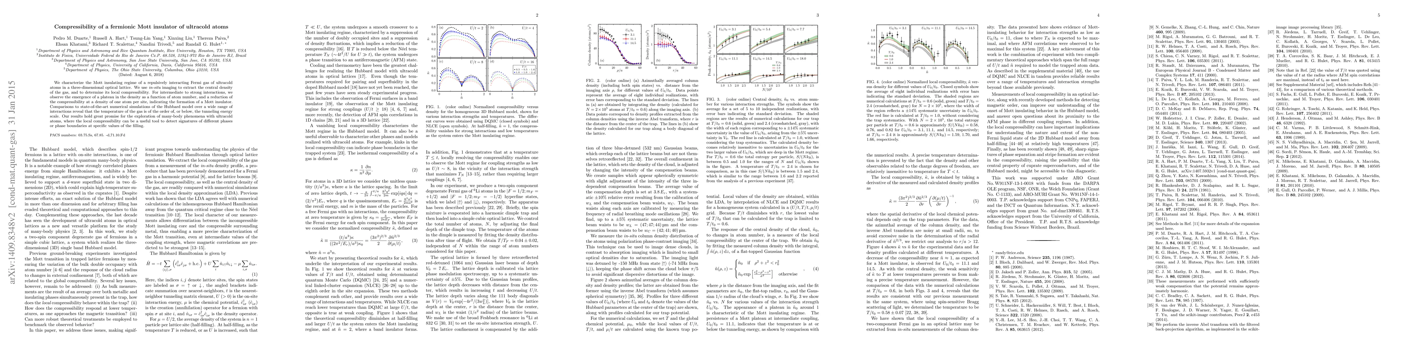 This study characterizes the compressibility of a fermionic Mott insulator in a three-dimensional optical lattice using ultracold atoms, observing a plateau in density and reduced compressibility at one atom per site, indicative of Mott insulating behavior. Comparisons with numerical simulations support that the system operates at or below the tunneling energy scale, promising insights into many-body phenomena.
