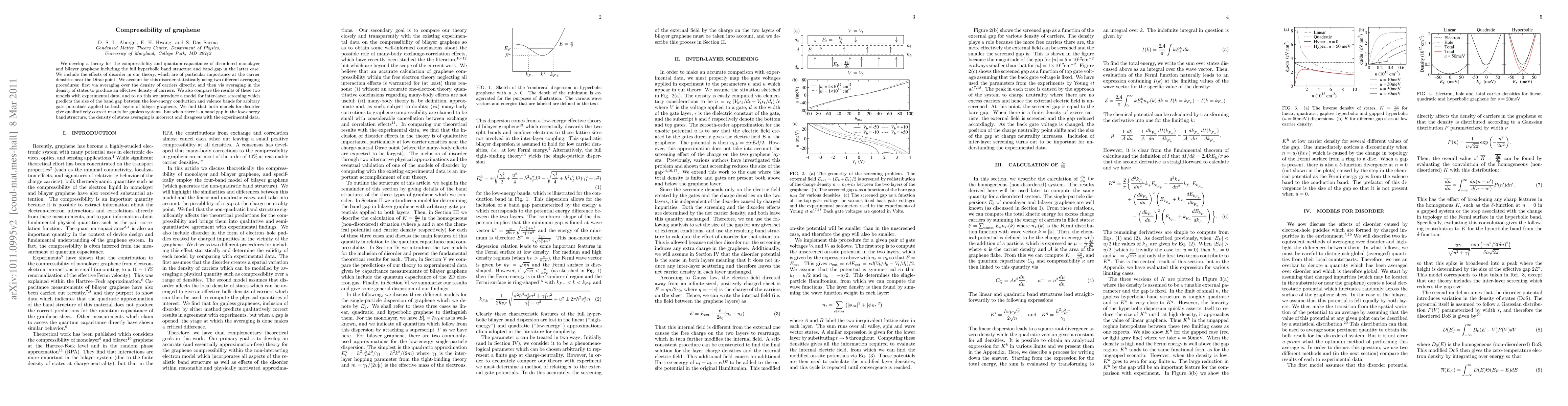 Researchers developed a theory to predict the compressibility and quantum capacitance of graphene, accounting for disorder in both monolayer and bilayer graphene systems. Their model shows that density of states averaging is incorrect when there is a band gap at charge neutrality, disagreeing with experimental data.
