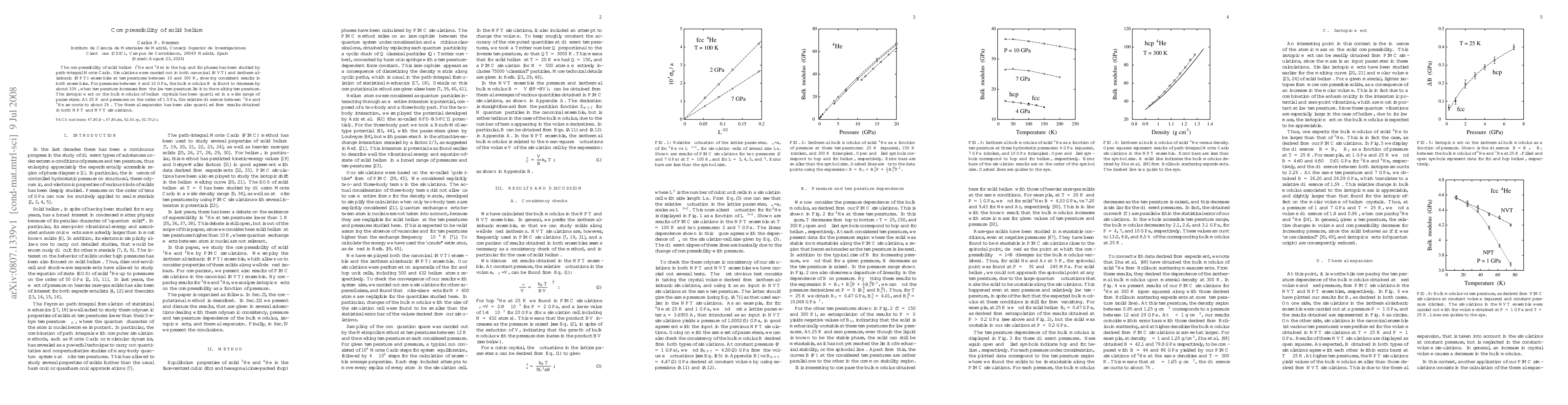 This study investigates the compressibility of solid helium (3He and 4He) in hcp and fcc phases using path-integral Monte Carlo simulations. Results show a 10% decrease in bulk modulus with temperature rise from 10 to 300 K under pressures of 4-10 GPa, highlighting a 2% relative difference between 3He and 4He at 25 K and 1 GPa.