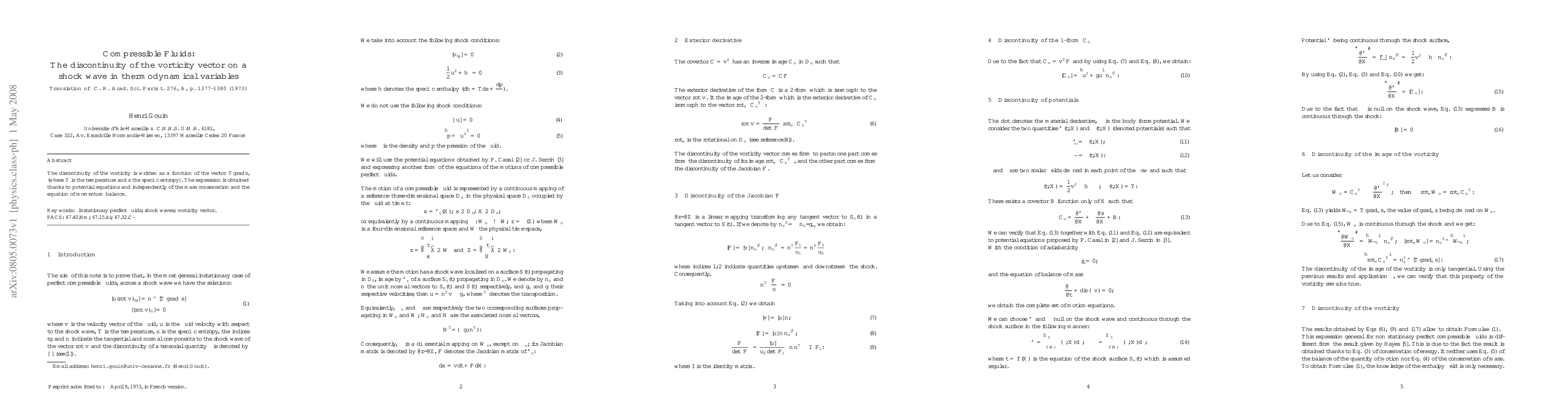 The discontinuity of the vorticity is written as a function of the vector T grad s, (where T is the temperature and s the specific entropy). The expression is obtained thanks to potential equations and independently of the mass conservation and the equation of momentum balance.