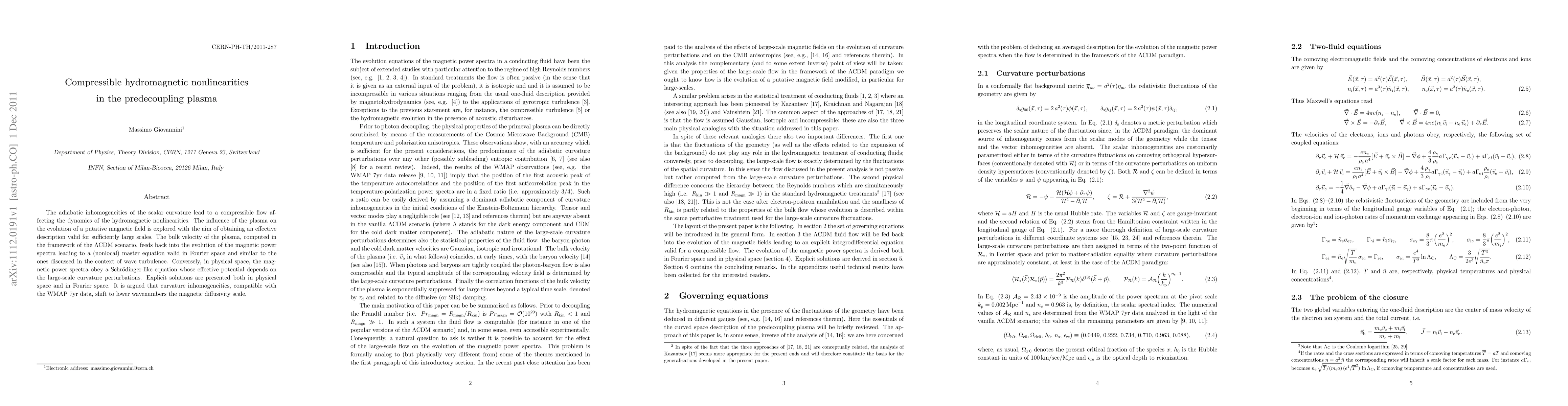 The adiabatic inhomogeneities of the scalar curvature lead to a compressible flow affecting the dynamics of the hydromagnetic nonlinearities. The influence of the plasma on the evolution of a putative magnetic field is explored with the aim of obtaining an effective description valid for sufficiently large scales. The bulk velocity of the plasma, computed in the framework of the LambdaCDM scenario, feeds back into the evolution of the magnetic power spectra leading to a (nonlocal) master equation valid in Fourier space and similar to the ones discussed in the context of wave turbulence. Conversely, in physical space, the magnetic power spectra obey a Schroedinger-like equation whose effective potential depends on the large-scale curvature perturbations. Explicit solutions are presented both in physical space and in Fourier space. It is argued that curvature inhomogeneities, compatible with the WMAP 7yr data, shift to lower wavenumbers the magnetic diffusivity scale.