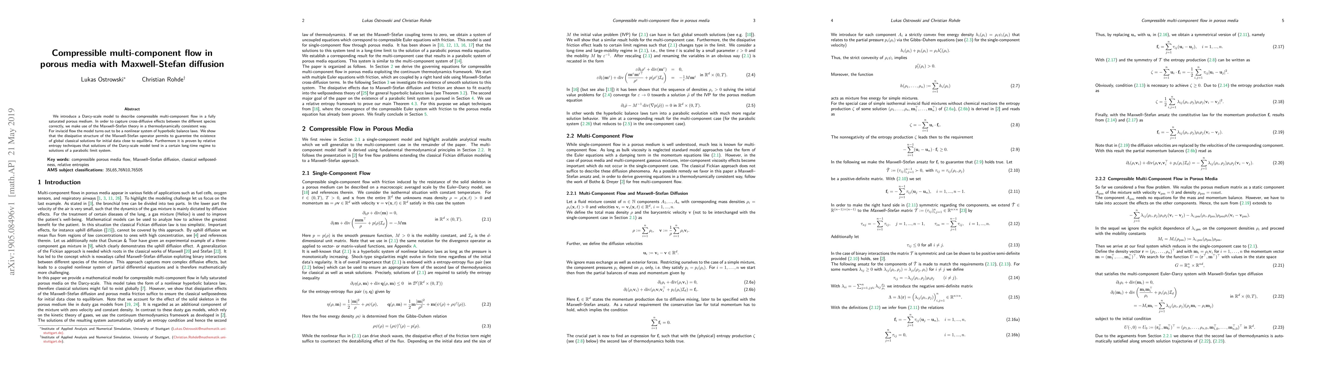 We introduce a Darcy-scale model to describe compressible multi-component flow in a fully saturated porous medium. In order to capture cross-diffusive effects between the different species correctly, we make use of the Maxwell--Stefan theory in a thermodynamically consistent way. For inviscid flow the model turns out to be a nonlinear system of hyperbolic balance laws. We show that the dissipative structure of the Maxwell-Stefan operator permits to guarantee the existence of global classical solutions for initial data close to equilibria. Furthermore it is proven by relative entropy techniques that solutions of the Darcy-scale model tend in a certain long-time regime to solutions of a parabolic limit system.