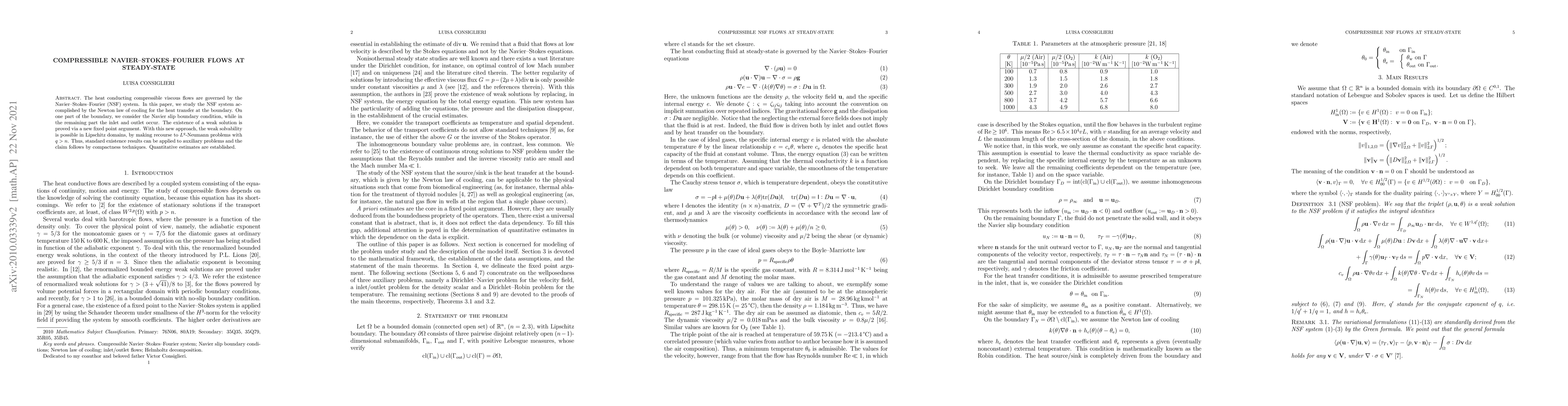 This research paper investigates steady-state heat-conducting compressible viscous flows governed by the Navier-Stokes-Fourier system, establishing existence of weak solutions in Lipschitz domains with new fixed point argument.