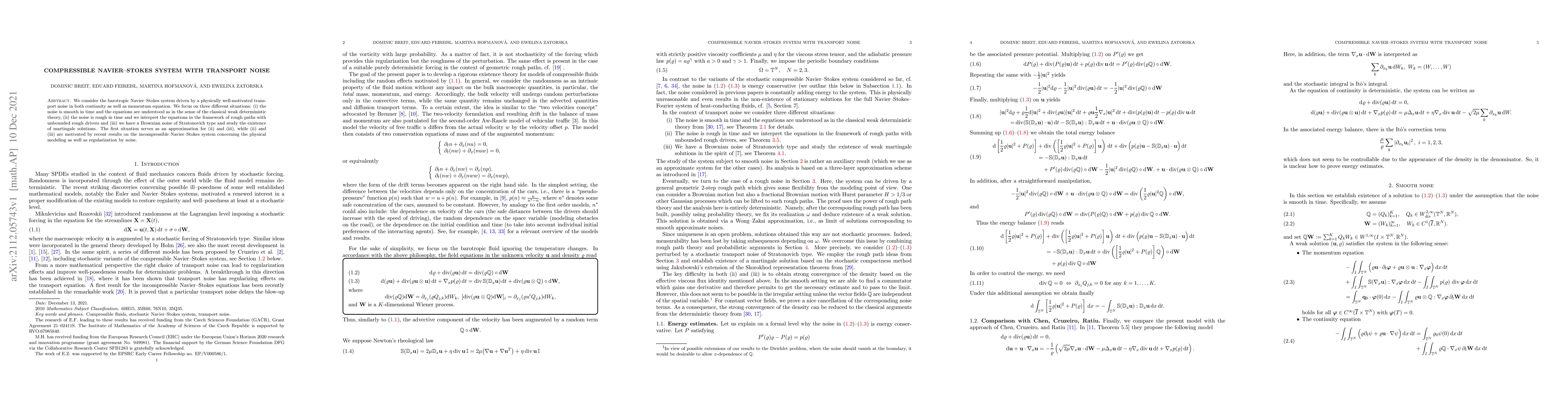 This paper investigates the barotropic Navier-Stokes system with transport noise, exploring three scenarios: classical weak deterministic theory with smooth noise, rough path interpretation with rough noise, and martingale solutions with Stratonovich Brownian noise. The study aims to understand the physical modeling and regularization effects of noise on the system.