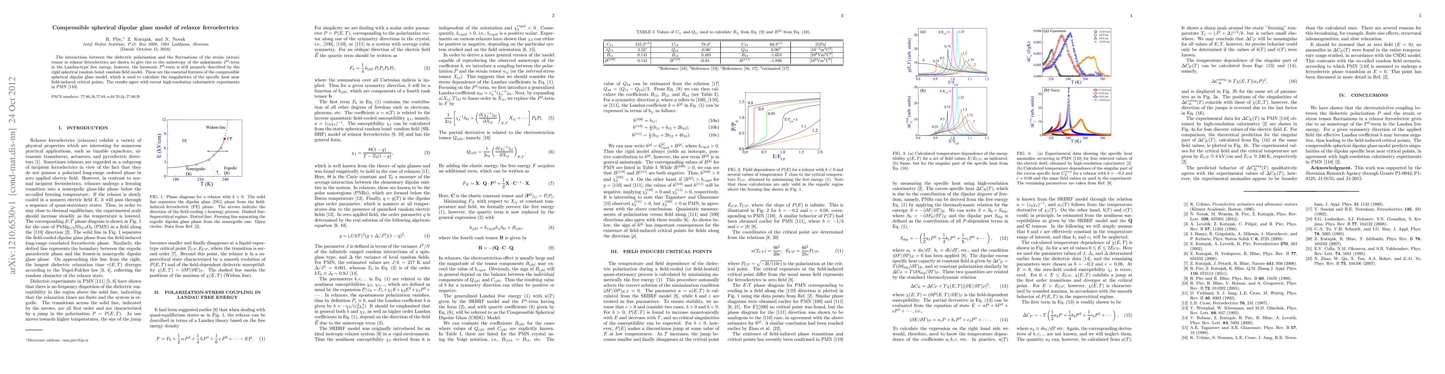 The interactions between the dielectric polarization and the fluctuations of the strain (stress) tensor in relaxor ferroelectrics are shown to give rise to the anisotropy of the anharmonic P4-term in the Landau-type free energy, however, the harmonic P2-term is still properly described by the rigid spherical random bond--random field model. These are the essential features of the compressible spherical dipolar glass model, which is used to calculate the singularities of the specific heat near field-induced critical points. The results agree with recent high-resolution calorimetric experiments in PMN [110].