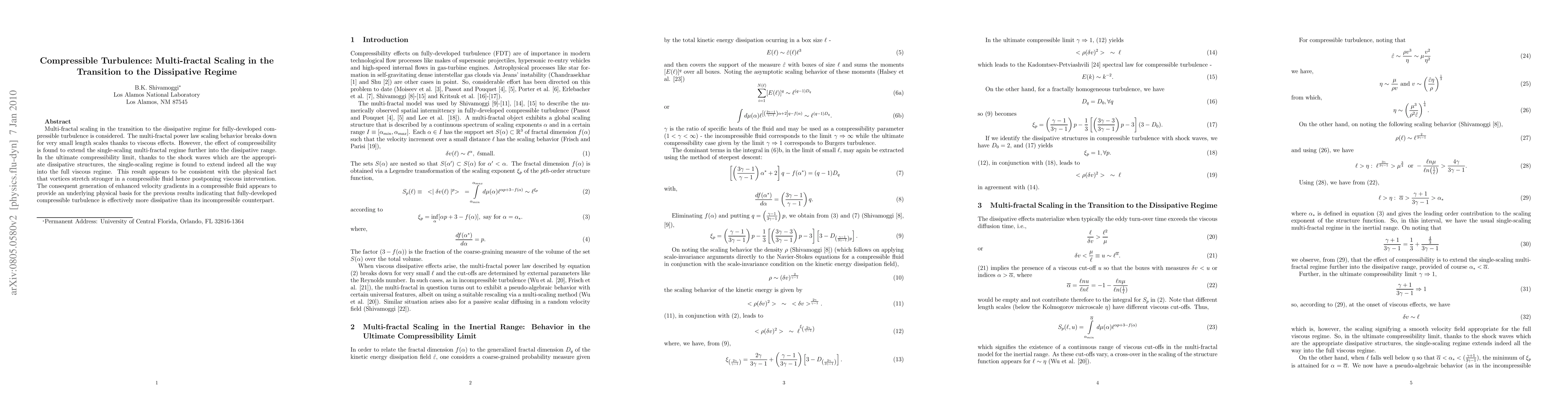 This paper explores the multi-fractal scaling behavior in compressible turbulence, revealing that compressibility extends the single-scaling multi-fractal regime into the dissipative range. The study finds that shock waves in compressible fluids lead to a more dissipative regime than in incompressible turbulence, due to stronger vortex stretching and enhanced velocity gradients.