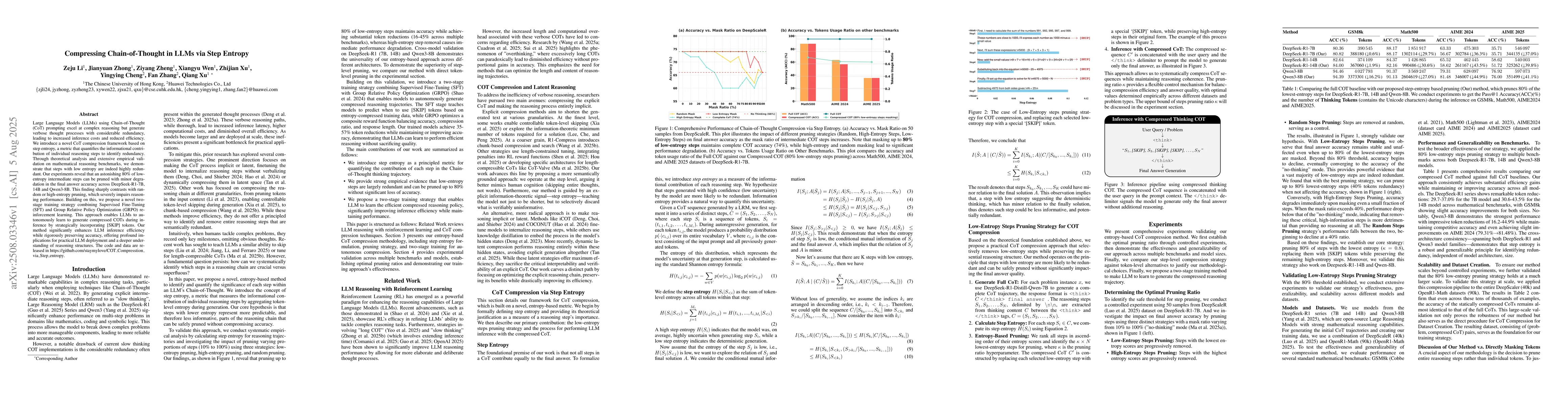 Large Language Models (LLMs) using Chain-of-Thought (CoT) prompting excel at complex reasoning but generate verbose thought processes with considerable redundancy, leading to increased inference costs and reduced efficiency. We introduce a novel CoT compression framework based on step entropy, a metric that quantifies the informational contribution of individual reasoning steps to identify redundancy. Through theoretical analysis and extensive empirical validation on mathematical reasoning benchmarks, we demonstrate that steps with low entropy are indeed highly redundant. Our experiments reveal that an astonishing 80\% of low-entropy intermediate steps can be pruned with minor degradation in the final answer accuracy across DeepSeek-R1-7B, 14B and Qwen3-8B. This finding sharply contrasts with random or high-entropy pruning, which severely impairs reasoning performance. Building on this, we propose a novel two-stage training strategy combining Supervised Fine-Tuning (SFT) and Group Relative Policy Optimization (GRPO) reinforcement learning. This approach enables LLMs to autonomously learn to generate compressed COTs during inference by strategically incorporating [SKIP] tokens. Our method significantly enhances LLM inference efficiency while rigorously preserving accuracy, offering profound implications for practical LLM deployment and a deeper understanding of reasoning structures.