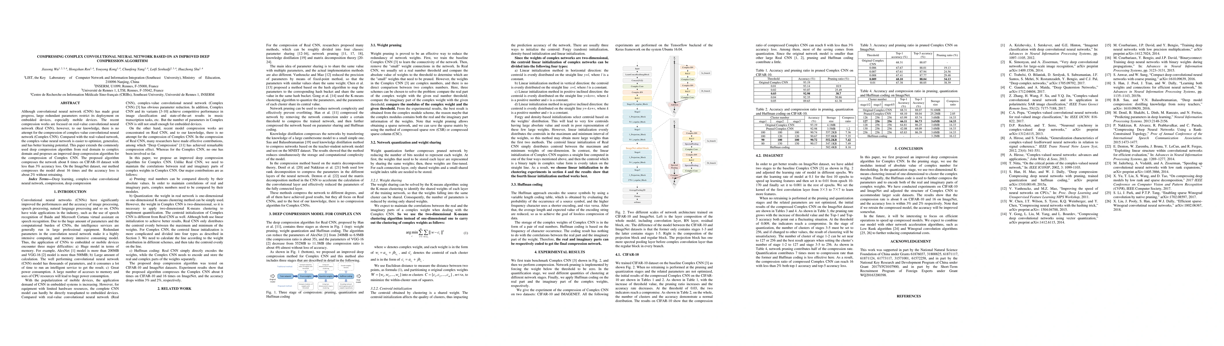 This paper proposes an improved deep compression algorithm to compress complex-value convolutional neural networks (Complex CNN), achieving up to 16 times compression with minimal accuracy loss on ImageNet and less than 3% loss on CIFAR-10. The method extends the deep compression algorithm to the complex domain, enhancing deployment on embedded devices.