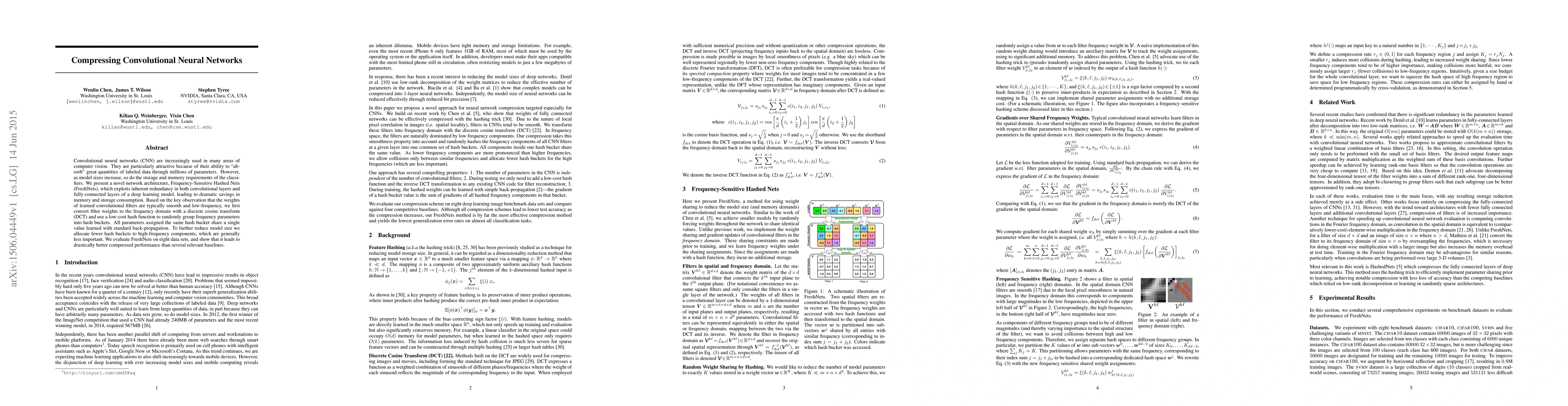 A new neural network architecture called Frequency-Sensitive Hashed Nets (FreshNets) reduces memory consumption by exploiting inherent redundancy in convolutional layers.