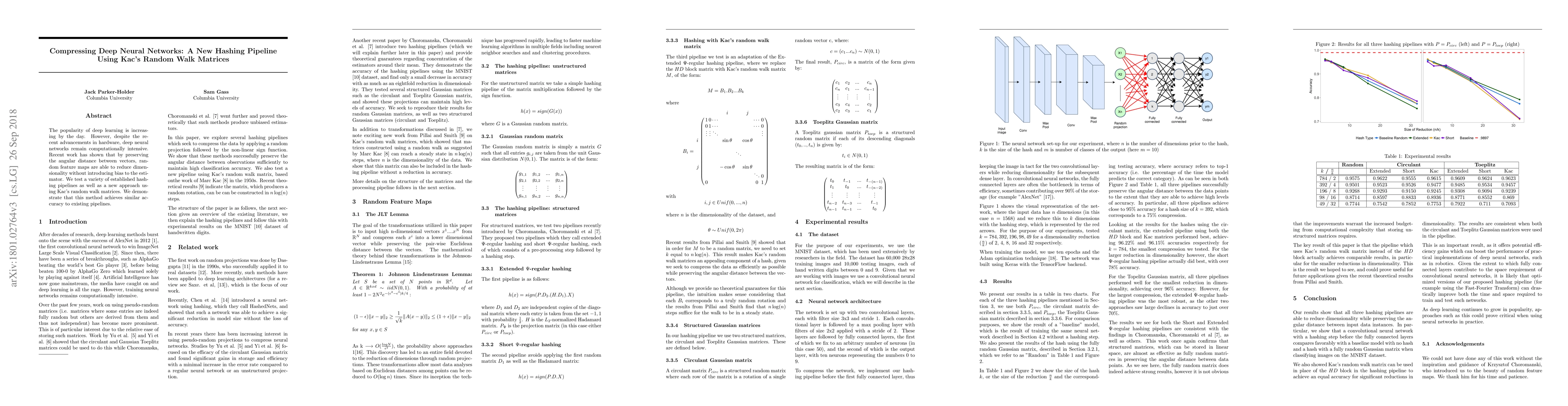 Researchers developed a new hashing pipeline using Kac's random walk matrices to compress deep neural networks without introducing bias, achieving similar accuracy to existing methods.
