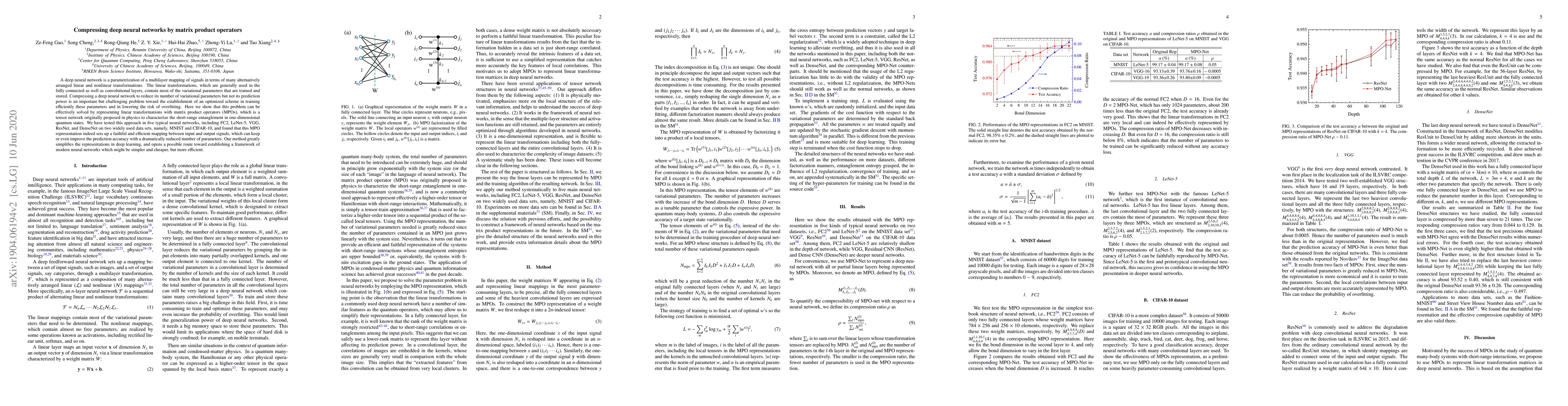 This paper proposes using matrix product operators (MPOs) to compress deep neural networks by representing linear transformations, significantly reducing the number of parameters while maintaining or improving prediction accuracy. The method was tested on various neural networks and datasets, demonstrating its effectiveness in simplifying deep learning representations.