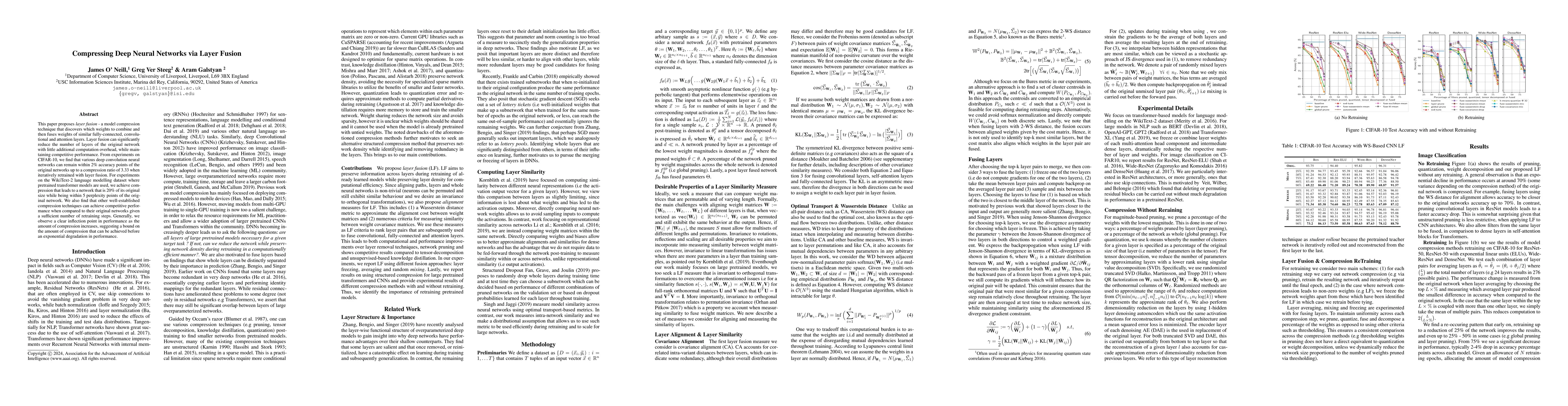 This paper introduces layer fusion, a model compression technique that combines weights of similar layers to reduce network size with minimal performance loss. Experiments show that deep neural networks can maintain accuracy within 2% while achieving up to 3.33x compression on CIFAR-10, and transformers can be compressed to 20% size with a 5 perplexity point loss on WikiText-2.