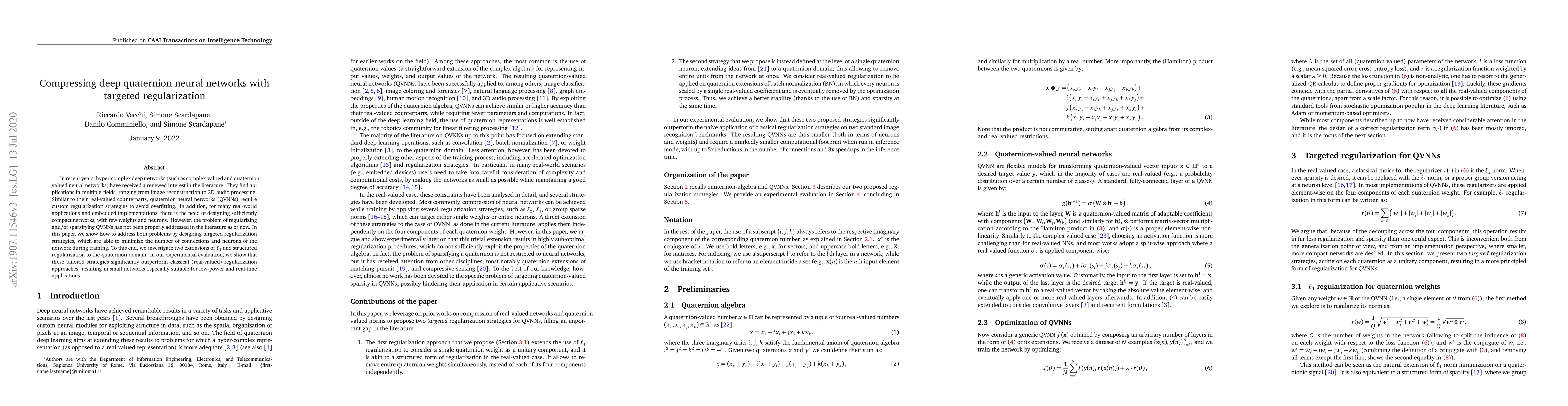 The paper proposes two targeted regularization strategies for compressing deep quaternion neural networks (QVNNs): (1) an extension of l1 and structured regularization to the quaternion domain, and (2) a method combining quaternion batch normalization (BN) layers with regularization on BN parameters to remove entire neurons.