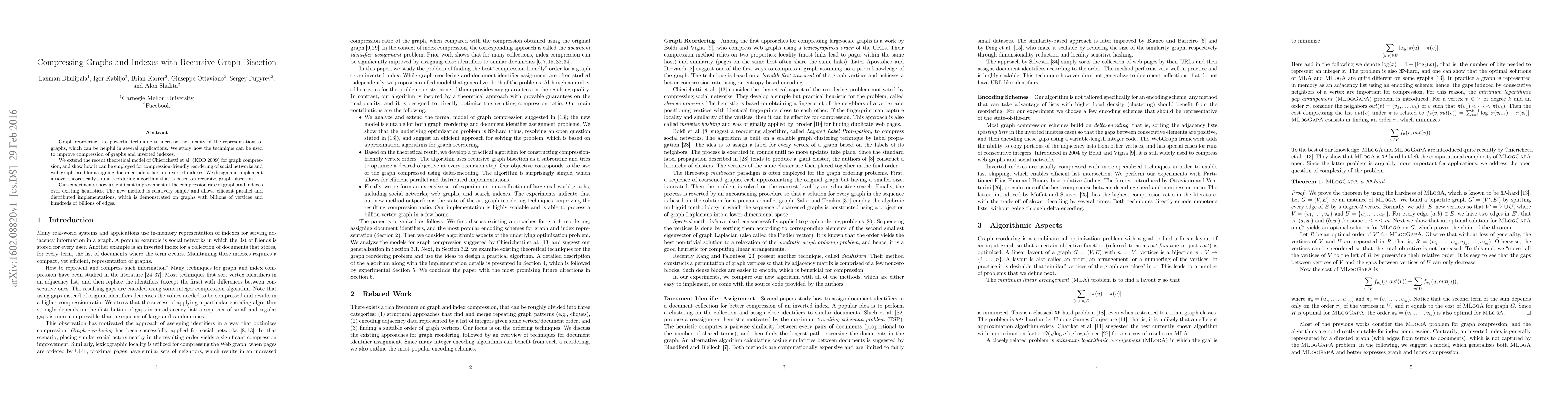 Graph reordering is a powerful technique to increase the locality of the representations of graphs, which can be helpful in several applications. We study how the technique can be used to improve compression of graphs and inverted indexes. We extend the recent theoretical model of Chierichetti et al. (KDD 2009) for graph compression, and show how it can be employed for compression-friendly reordering of social networks and web graphs and for assigning document identifiers in inverted indexes. We design and implement a novel theoretically sound reordering algorithm that is based on recursive graph bisection. Our experiments show a significant improvement of the compression rate of graph and indexes over existing heuristics. The new method is relatively simple and allows efficient parallel and distributed implementations, which is demonstrated on graphs with billions of vertices and hundreds of billions of edges.