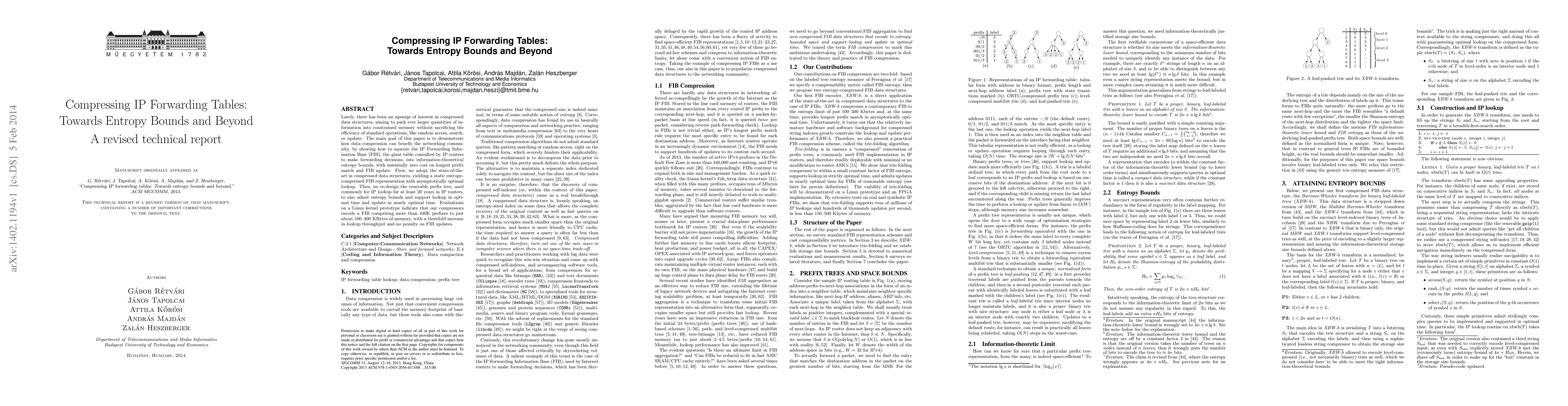 Lately, there has been an upsurge of interest in compressed data structures, aiming to pack ever larger quantities of information into constrained memory without sacrificing the efficiency of standard operations, like random access, search, or update. The main goal of this paper is to demonstrate how data compression can benefit the networking community, by showing how to squeeze the IP Forwarding Information Base (FIB), the giant table consulted by IP routers to make forwarding decisions, into information-theoretical entropy bounds, with essentially zero cost on longest prefix match and FIB update. First, we adopt the state-of-the-art in compressed data structures, yielding a static entropy-compressed FIB representation with asymptotically optimal lookup. Then, we re-design the venerable prefix tree, used commonly for IP lookup for at least 20 years in IP routers, to also admit entropy bounds and support lookup in optimal time and update in nearly optimal time. Evaluations on a Linux kernel prototype indicate that our compressors encode a FIB comprising more than 440K prefixes to just about 100--400 KBytes of memory, with a threefold increase in lookup throughput and no penalty on FIB updates. This technical report contains a number of important corrections and revisions to the original manuscript.