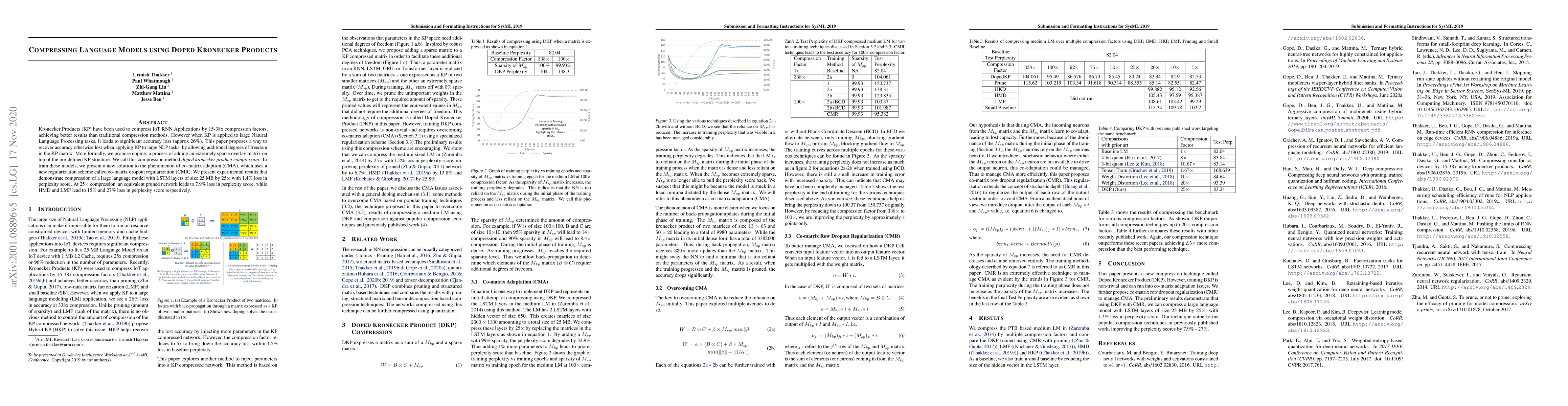 Kronecker Products (KP) have been used to compress IoT RNN Applications by 15-38x compression factors, achieving better results than traditional compression methods. However when KP is applied to large Natural Language Processing tasks, it leads to significant accuracy loss (approx 26%). This paper proposes a way to recover accuracy otherwise lost when applying KP to large NLP tasks, by allowing additional degrees of freedom in the KP matrix. More formally, we propose doping, a process of adding an extremely sparse overlay matrix on top of the pre-defined KP structure. We call this compression method doped kronecker product compression. To train these models, we present a new solution to the phenomenon of co-matrix adaption (CMA), which uses a new regularization scheme called co matrix dropout regularization (CMR). We present experimental results that demonstrate compression of a large language model with LSTM layers of size 25 MB by 25x with 1.4% loss in perplexity score. At 25x compression, an equivalent pruned network leads to 7.9% loss in perplexity score, while HMD and LMF lead to 15% and 27% loss in perplexity score respectively.