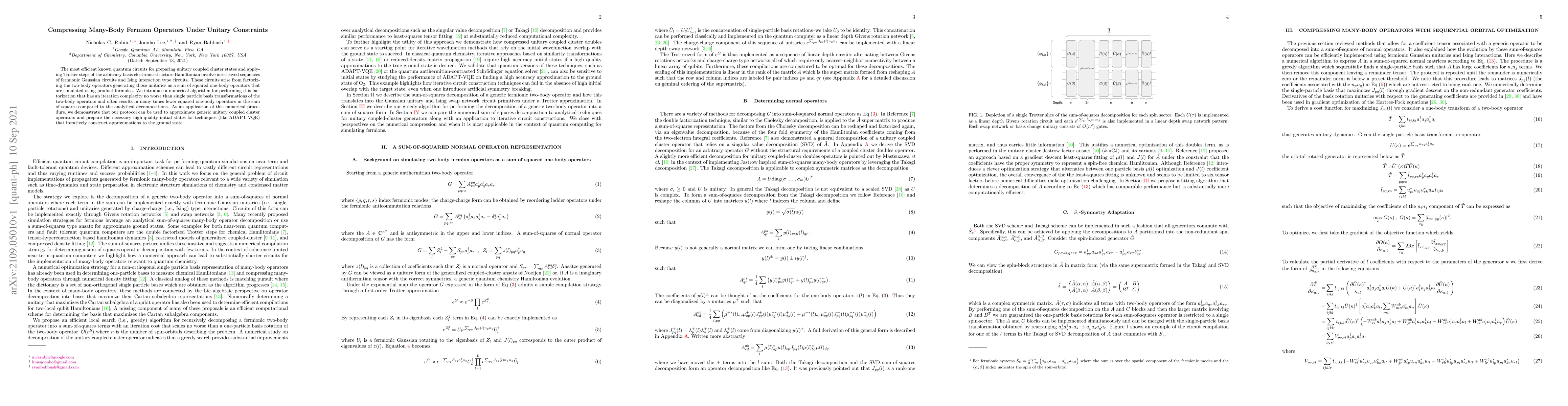 The most efficient known quantum circuits for preparing unitary coupled cluster states and applying Trotter steps of the arbitrary basis electronic structure Hamiltonian involve interleaved sequences of fermionic Gaussian circuits and Ising interaction type circuits. These circuits arise from factorizing the two-body operators generating those unitaries as a sum of squared one-body operators that are simulated using product formulas. We introduce a numerical algorithm for performing this factorization that has an iteration complexity no worse than single particle basis transformations of the two-body operators and often results in many times fewer squared one-body operators in the sum of squares compared to the analytical decompositions. As an application of this numerical procedure, we demonstrate that our protocol can be used to approximate generic unitary coupled cluster operators and prepare the necessary high-quality initial states for techniques (like ADAPT-VQE) that iteratively construct approximations to the ground state.