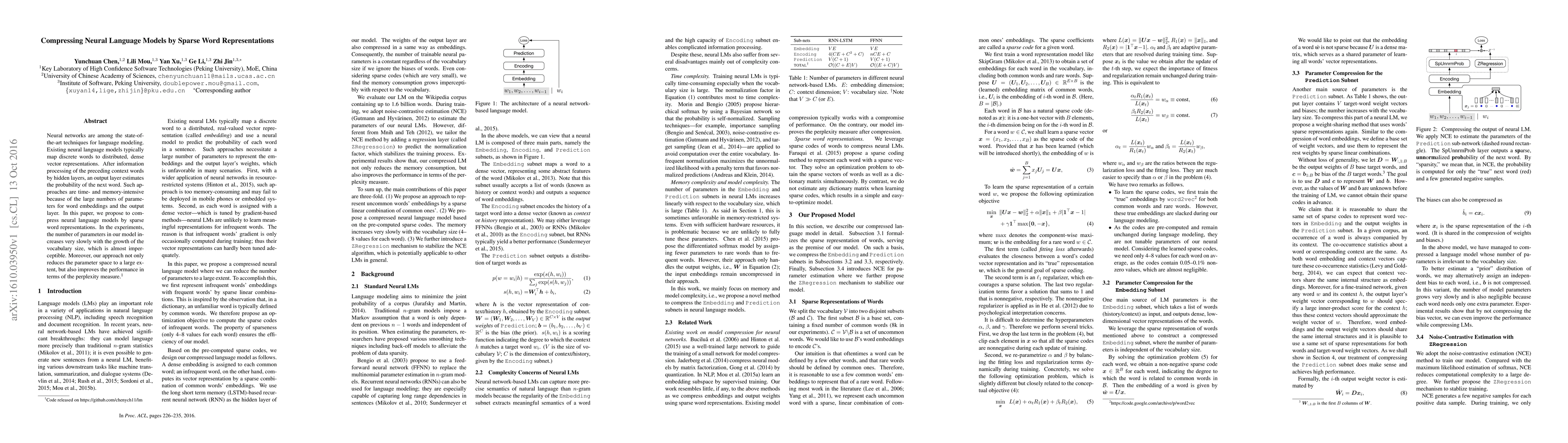 This paper proposes a method to compress neural language models by using sparse word representations, significantly reducing the number of parameters and improving performance in perplexity while maintaining vocabulary size. The approach achieves a slow increase in parameters with vocabulary growth, enhancing both efficiency and effectiveness.