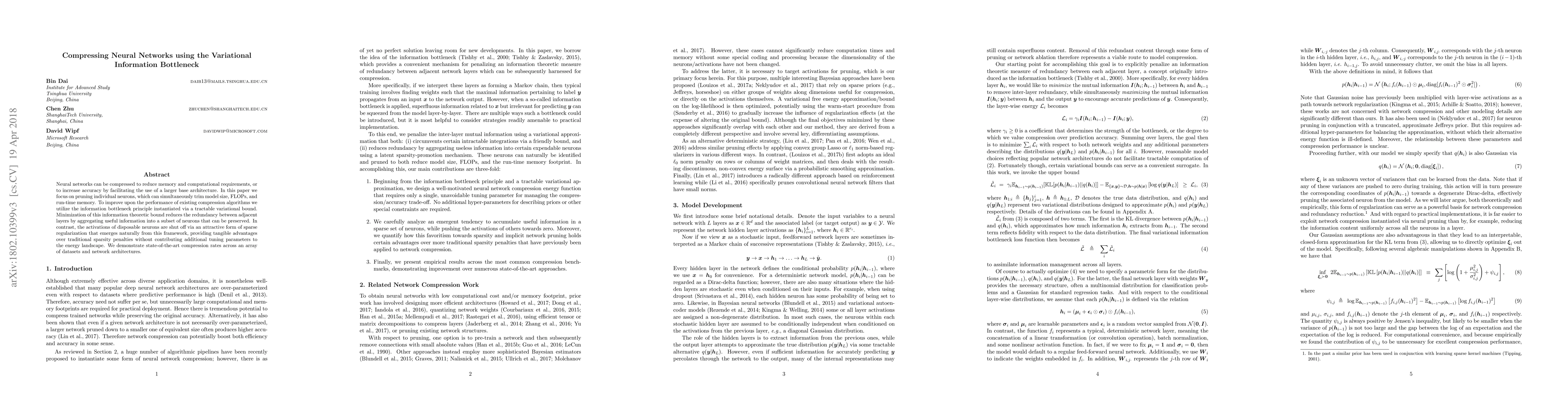 A new method for compressing neural networks using variational information bottleneck achieves state-of-the-art compression rates across various datasets and architectures, reducing model size, FLOPs, and memory usage while maintaining performance.