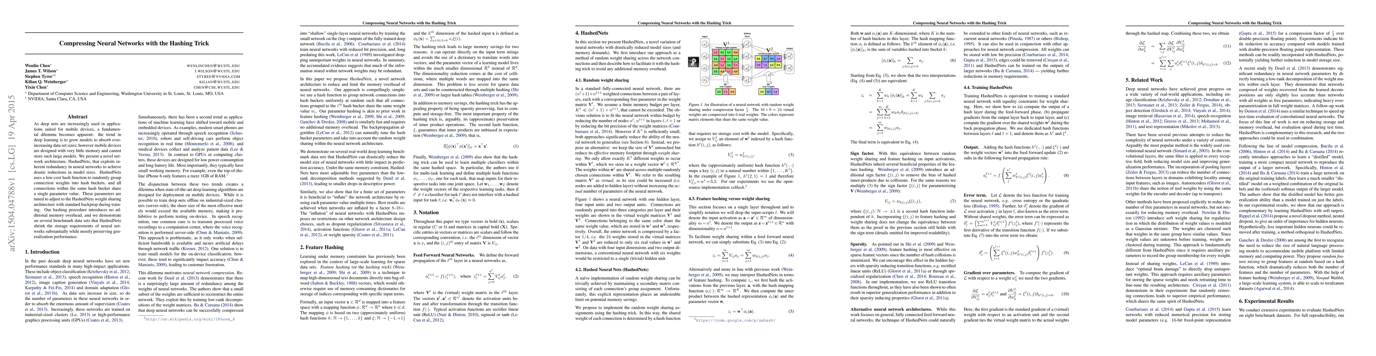 As deep nets are increasingly used in applications suited for mobile devices, a fundamental dilemma becomes apparent: the trend in deep learning is to grow models to absorb ever-increasing data set sizes; however mobile devices are designed with very little memory and cannot store such large models. We present a novel network architecture, HashedNets, that exploits inherent redundancy in neural networks to achieve drastic reductions in model sizes. HashedNets uses a low-cost hash function to randomly group connection weights into hash buckets, and all connections within the same hash bucket share a single parameter value. These parameters are tuned to adjust to the HashedNets weight sharing architecture with standard backprop during training. Our hashing procedure introduces no additional memory overhead, and we demonstrate on several benchmark data sets that HashedNets shrink the storage requirements of neural networks substantially while mostly preserving generalization performance.