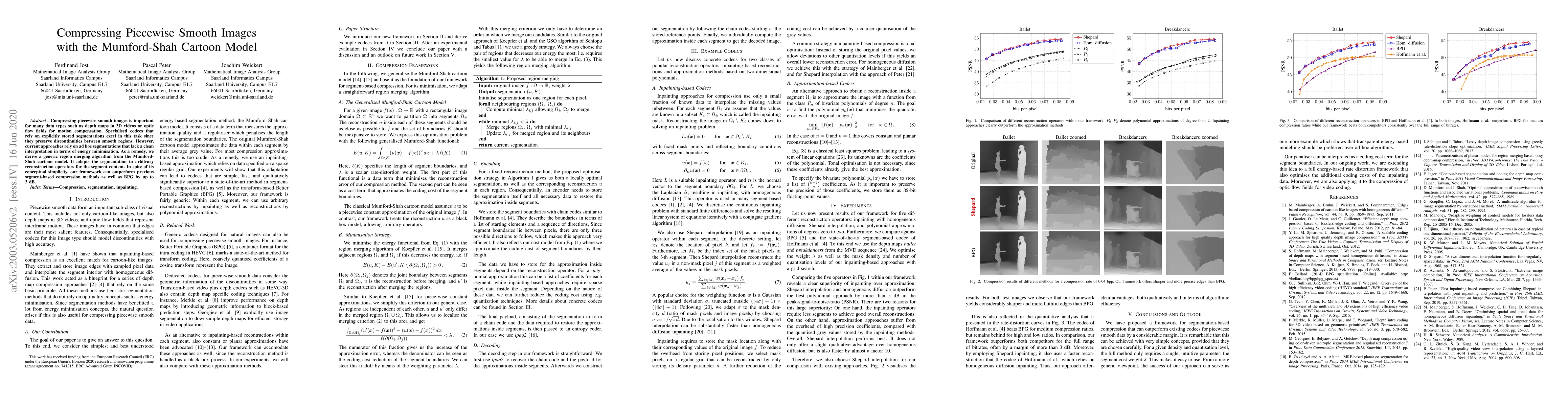 Compressing piecewise smooth images is important for many data types such as depth maps in 3D videos or optic flow fields for motion compensation. Specialised codecs that rely on explicitly stored segmentations excel in this task since they preserve discontinuities between smooth regions. However, current approaches rely on ad hoc segmentations that lack a clean interpretation in terms of energy minimisation. As a remedy, we derive a generic region merging algorithm from the Mumford-Shah cartoon model. It adapts the segmentation to arbitrary reconstruction operators for the segment content. In spite of its conceptual simplicity, our framework can outperform previous segment-based compression methods as well as BPG by up to 3 dB.
