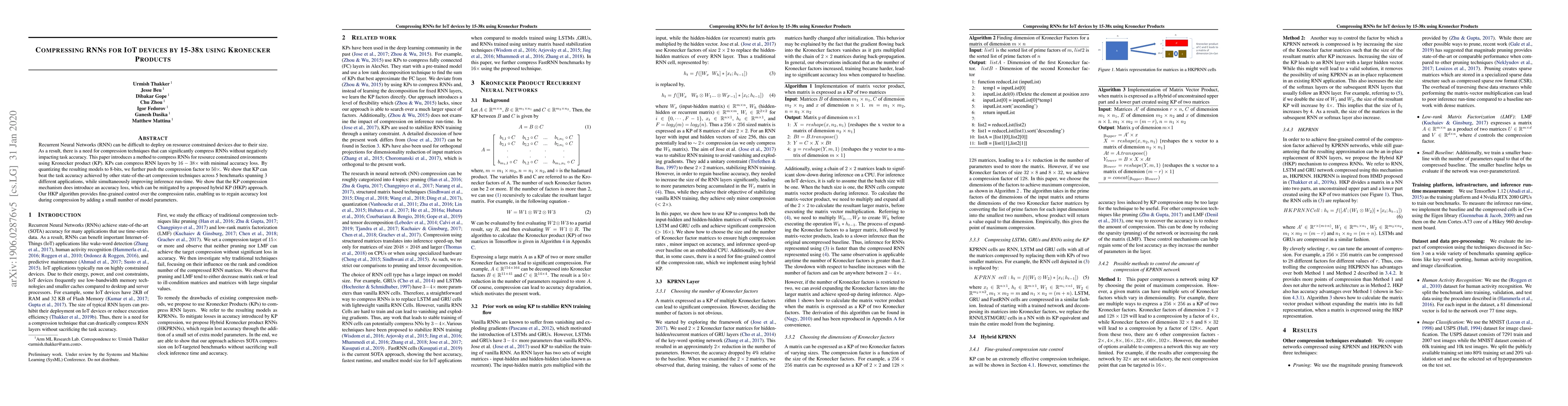 Recurrent Neural Networks (RNN) can be difficult to deploy on resource constrained devices due to their size.As a result, there is a need for compression techniques that can significantly compress RNNs without negatively impacting task accuracy. This paper introduces a method to compress RNNs for resource constrained environments using Kronecker product (KP). KPs can compress RNN layers by 15-38x with minimal accuracy loss. By quantizing the resulting models to 8-bits, we further push the compression factor to 50x. We show that KP can beat the task accuracy achieved by other state-of-the-art compression techniques across 5 benchmarks spanning 3 different applications, while simultaneously improving inference run-time. We show that the KP compression mechanism does introduce an accuracy loss, which can be mitigated by a proposed hybrid KP (HKP) approach. Our HKP algorithm provides fine-grained control over the compression ratio, enabling us to regain accuracy lost during compression by adding a small number of model parameters.