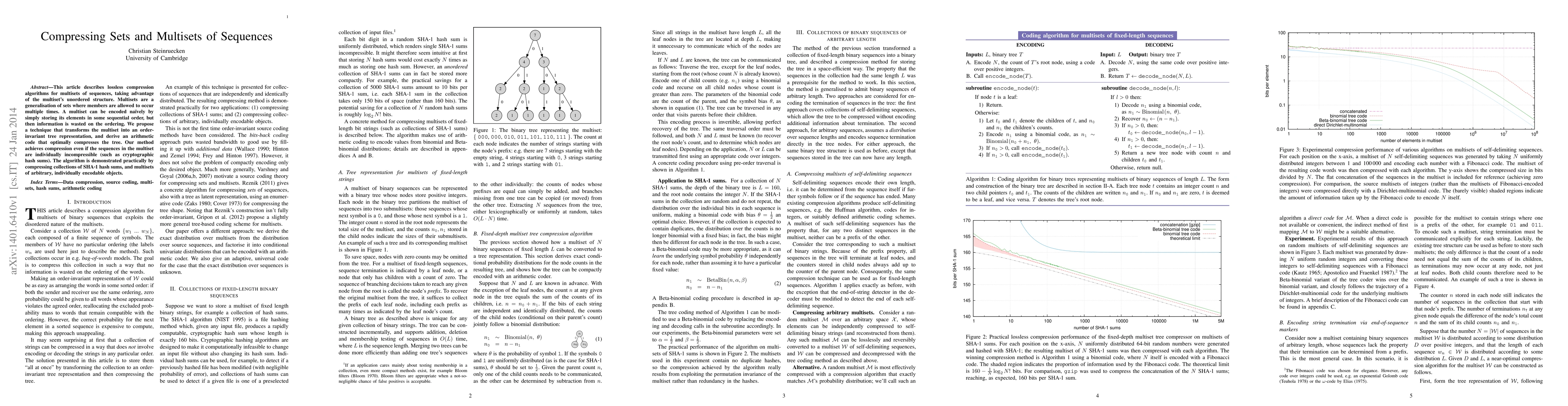 This paper proposes a lossless compression technique for multisets of sequences by transforming their unordered structure into an order-invariant tree representation, which is then optimally compressed using arithmetic coding. The method effectively compresses even individually incompressible sequences like cryptographic hash sums.