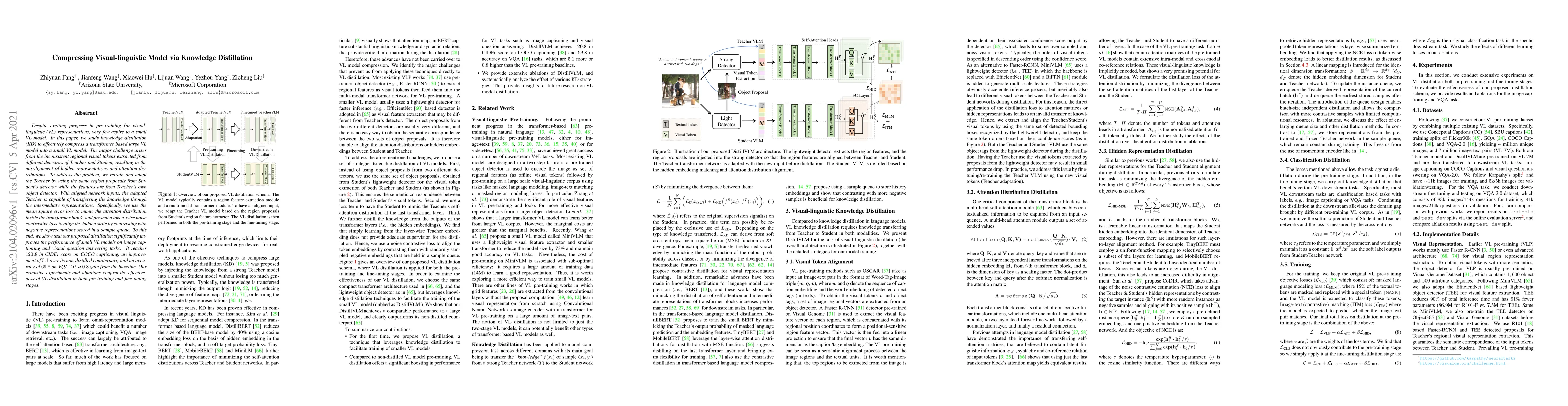 This paper proposes knowledge distillation to compress a large transformer-based visual-linguistic model into a smaller one, addressing the challenge of mismatched region proposals from different detectors. The adapted Teacher model aligns with Student's detector to transfer knowledge via intermediate representations, achieving significant performance gains in image captioning and visual question answering tasks.