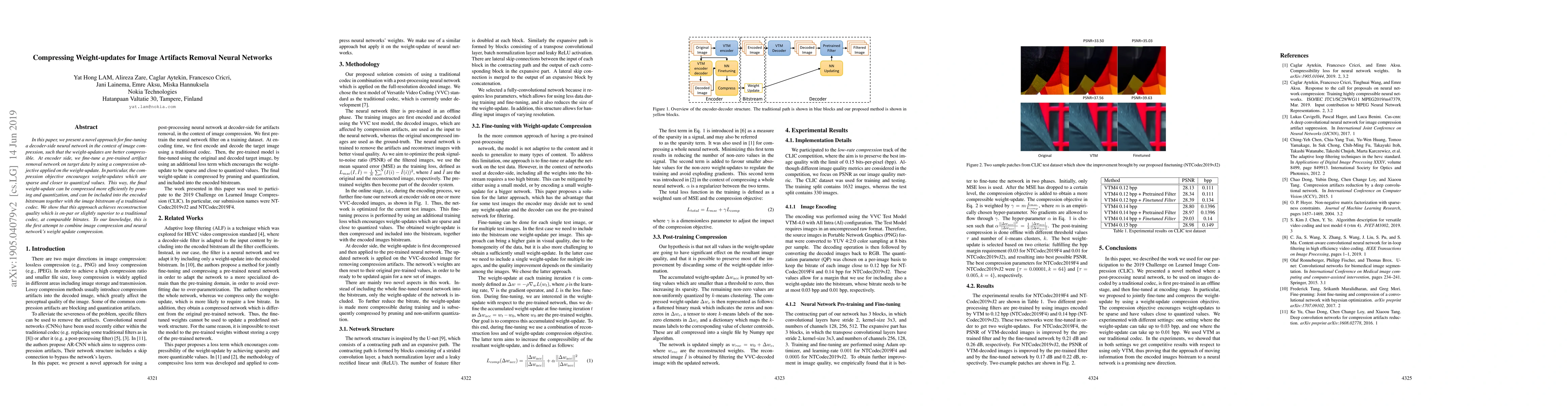 This paper introduces a method to compress weight-updates for fine-tuning a neural network used in image artifact removal during compression, achieving efficient compression through sparsity and quantization. The approach maintains reconstruction quality comparable to traditional codecs.
