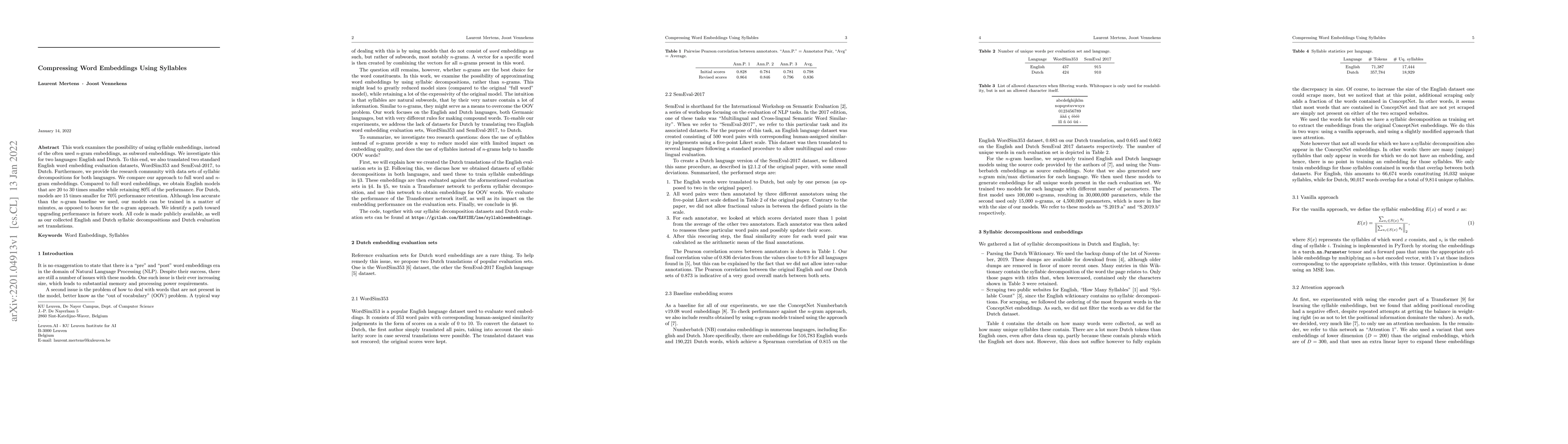 This study investigates syllable embeddings as an alternative to $n$-gram embeddings for word representations, achieving significantly smaller models for both English and Dutch while maintaining substantial performance. The approach is faster to train compared to $n$-gram methods, though it currently lags in accuracy.