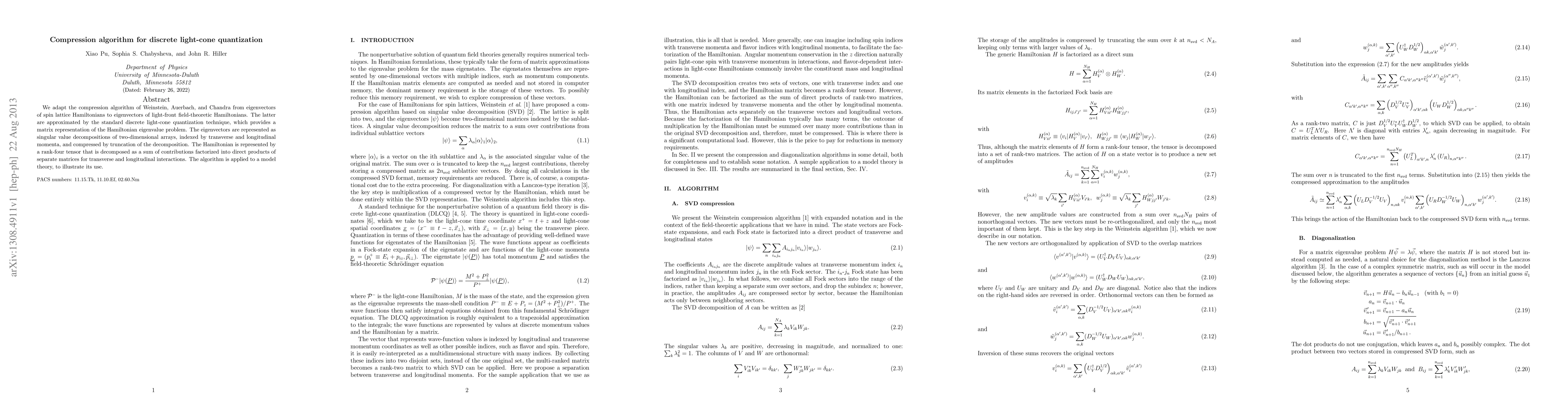 We adapt the compression algorithm of Weinstein, Auerbach, and Chandra from eigenvectors of spin lattice Hamiltonians to eigenvectors of light-front field-theoretic Hamiltonians. The latter are approximated by the standard discrete light-cone quantization technique, which provides a matrix representation of the Hamiltonian eigenvalue problem. The eigenvectors are represented as singular value decompositions of two-dimensional arrays, indexed by transverse and longitudinal momenta, and compressed by truncation of the decomposition. The Hamiltonian is represented by a rank-four tensor that is decomposed as a sum of contributions factorized into direct products of separate matrices for transverse and longitudinal interactions. The algorithm is applied to a model theory, to illustrate its use.