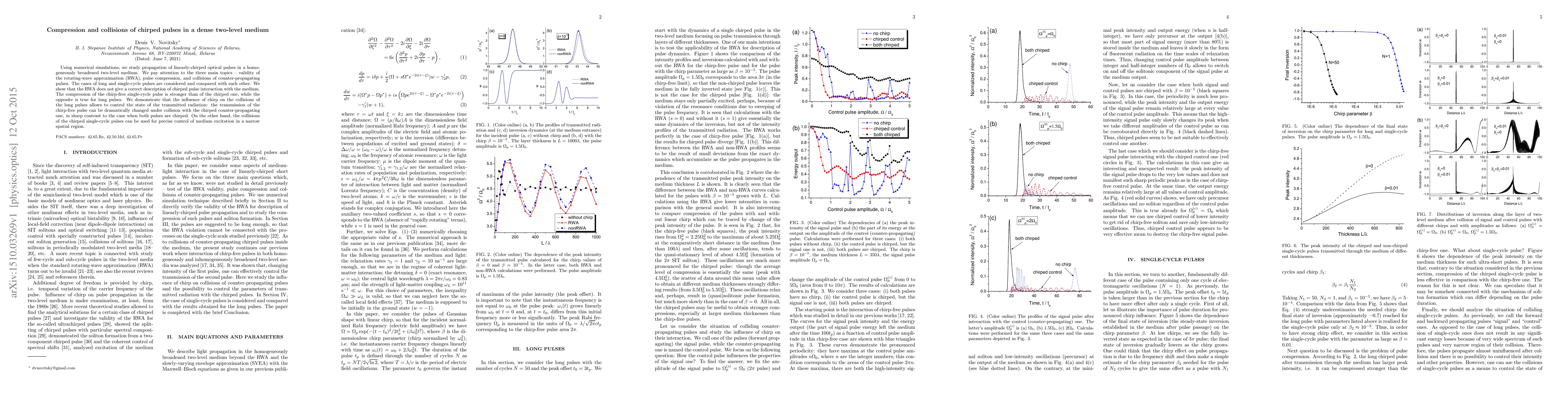 This paper investigates the propagation of linearly-chirped optical pulses in a dense two-level medium, focusing on the rotating-wave approximation, pulse compression, and pulse collisions. It finds that the rotating-wave approximation fails to describe chirped pulse interactions, and that pulse compression varies with chirp and pulse length, while collisions of long pulses can significantly alter transmitted radiation states.