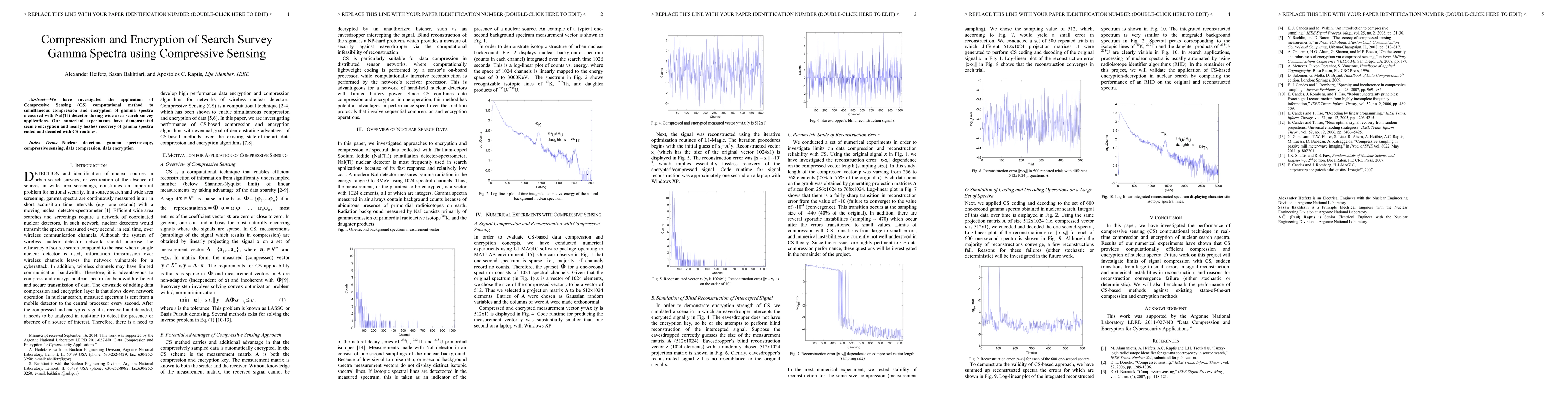 Summary: This paper explores the use of Compressive Sensing for simultaneous compression and encryption of gamma spectra from NaI(Tl) detectors in search surveys, showing successful secure encryption and nearly lossless recovery through numerical experiments.