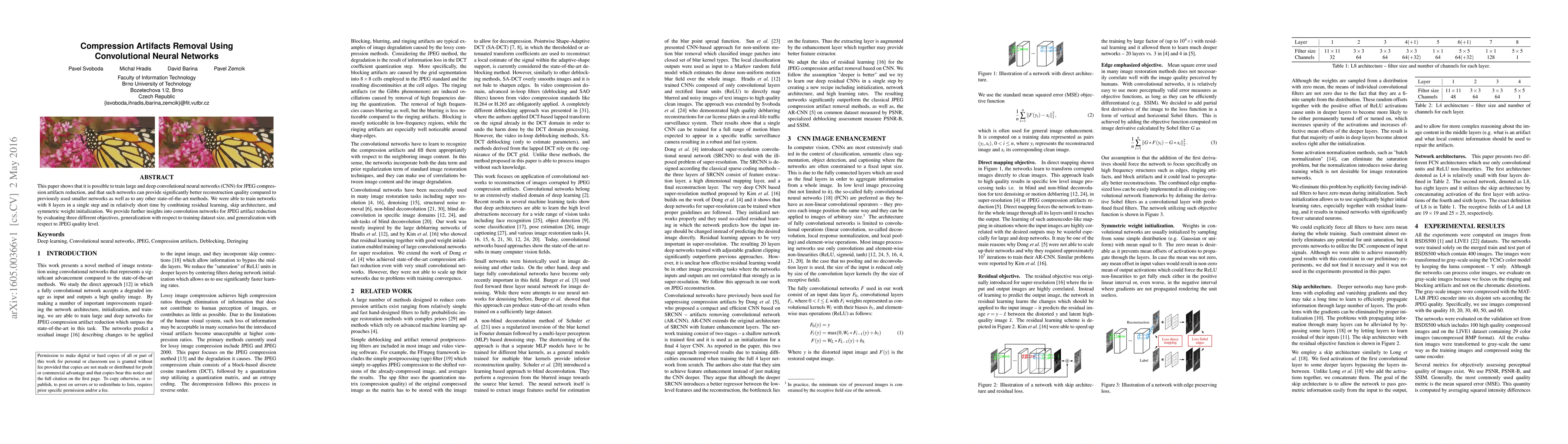 This paper demonstrates the effectiveness of large, deep convolutional neural networks for reducing JPEG compression artifacts, achieving superior reconstruction quality compared to smaller networks and other methods. The authors employ residual learning, skip architecture, and symmetric weight initialization to train 8-layer networks efficiently.