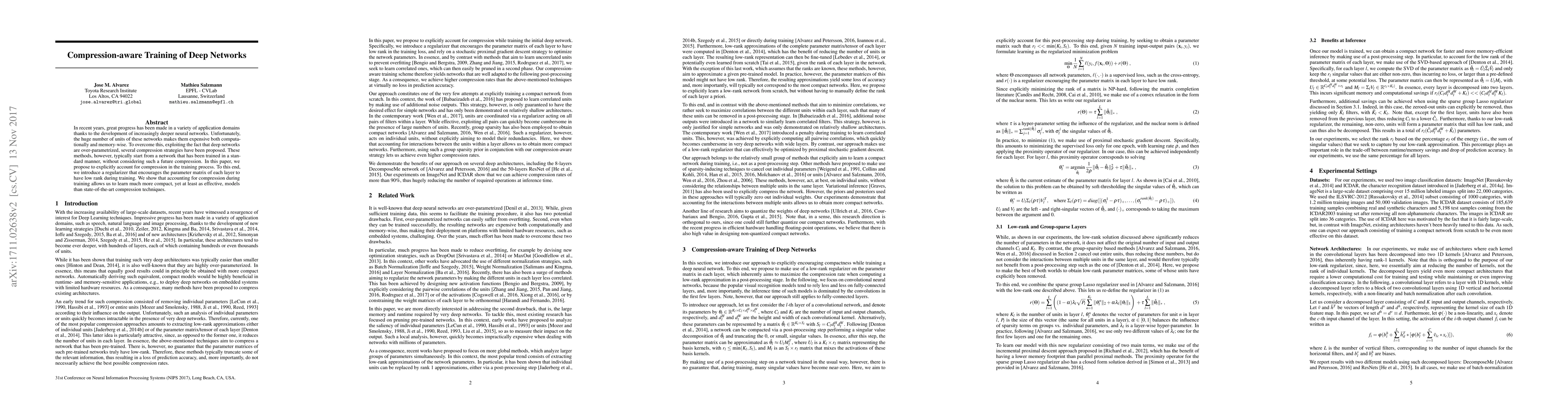 This paper proposes a novel training method that incorporates compression strategies directly into the training process, using a regularizer to encourage low-rank parameter matrices. This approach enables the creation of more compact neural networks that are at least as effective as those compressed post-training.