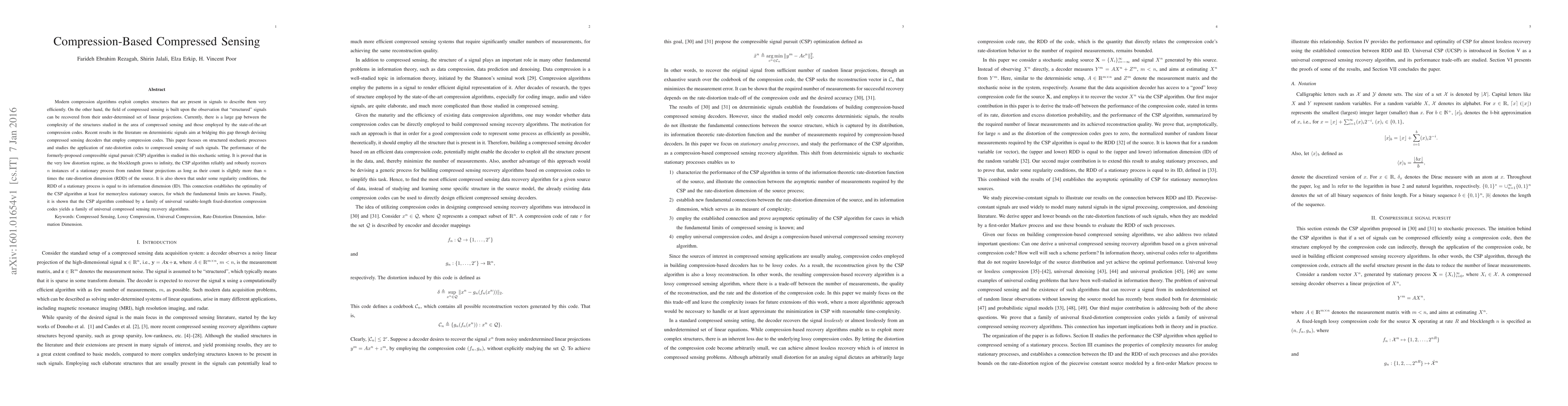This paper explores the integration of compression techniques into compressed sensing for structured stochastic processes, demonstrating that the compressible signal pursuit (CSP) algorithm can reliably recover signals from under-determined projections when the projection count exceeds the rate-distortion dimension of the source. It establishes the optimality of CSP for memoryless stationary sources and shows that combining CSP with universal compression codes results in a family of universal compressed sensing recovery algorithms.