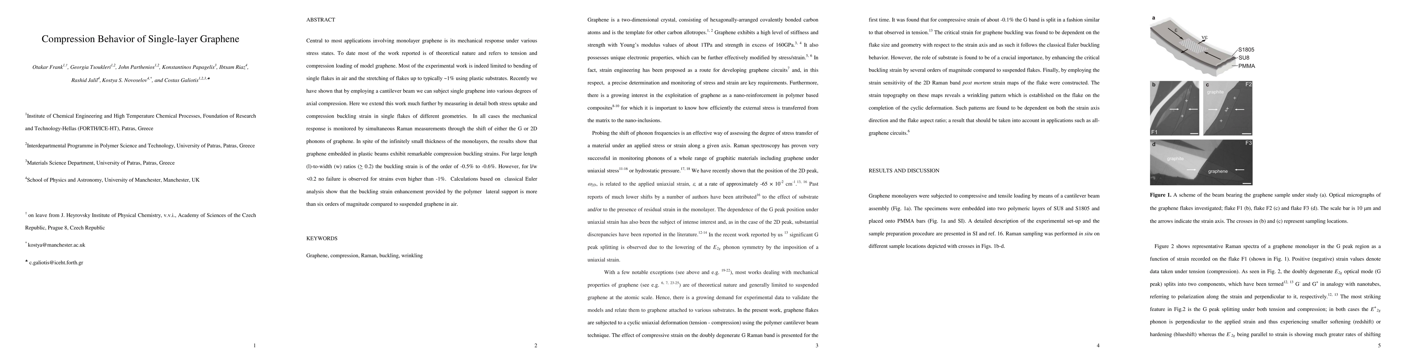 Central to most applications involving monolayer graphene is its mechanical response under various stress states. To date most of the work reported is of theoretical nature and refers to tension and compression loading of model graphene. Most of the experimental work is indeed limited to bending of single flakes in air and the stretching of flakes up to typically ~1% using plastic substrates. Recently we have shown that by employing a cantilever beam we can subject single graphene into various degrees of axial compression. Here we extend this work much further by measuring in detail both stress uptake and compression buckling strain in single flakes of different geometries. In all cases the mechanical response is monitored by simultaneous Raman measurements through the shift of either the G or 2D phonons of graphene. In spite of the infinitely small thickness of the monolayers, the results show that graphene embedded in plastic beams exhibit remarkable compression buckling strains. For large length (l)-to-width (w) ratios (> 0.2) the buckling strain is of the order of -0.5% to -0.6%. However, for l/w <0.2 no failure is observed for strains even higher than -1%. Calculations based on classical Euler analysis show that the buckling strain enhancement provided by the polymer lateral support is more than six orders of magnitude compared to suspended graphene in air.