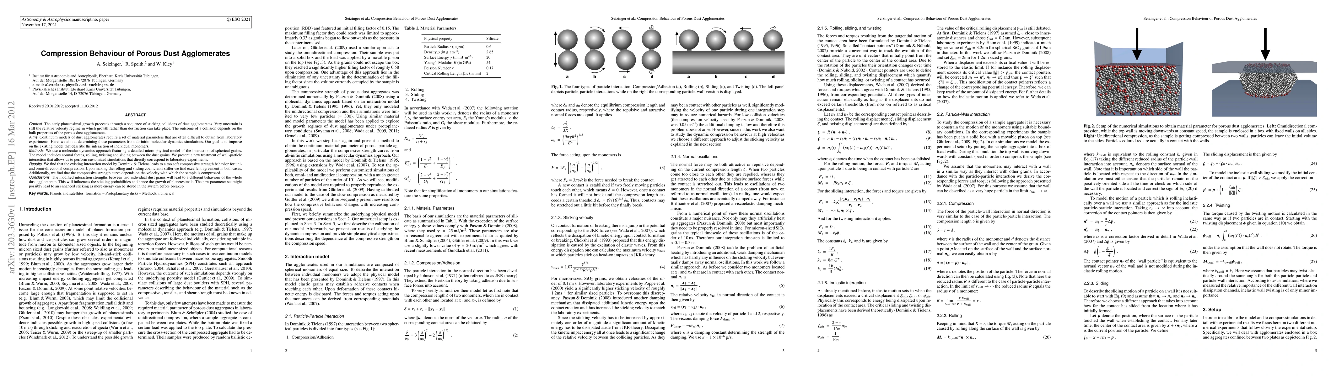This paper investigates the compression behavior of porous dust agglomerates using ab-initio molecular dynamics simulations to determine material parameters for continuum models. The study finds that modifying rolling and sliding coefficients improves the model's predictive accuracy for compressive strength, which influences planetesimal growth by affecting sticking probabilities.