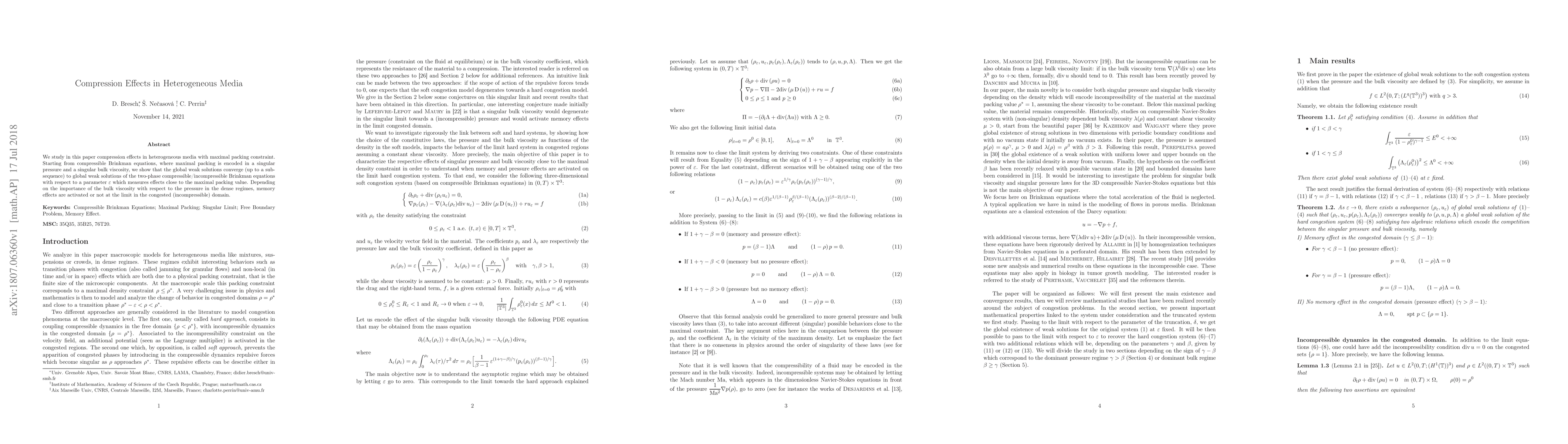 We study in this paper compression effects in heterogeneous media with maximal packing constraint. Starting from compressible Brinkman equations, where maximal packing is encoded in a singular pressure and a singular bulk viscosity, we show that the global weak solutions converge (up to a subsequence) to global weak solutions of the two-phase compressible/incompressible Brinkman equations with respect to a parameter $\varepsilon$ which measures effects close to the maximal packing value. Depending on the importance of the bulk viscosity with respect to the pressure in the dense regimes, memory effects are activated or not at the limit in the congested (incompressible) domain.