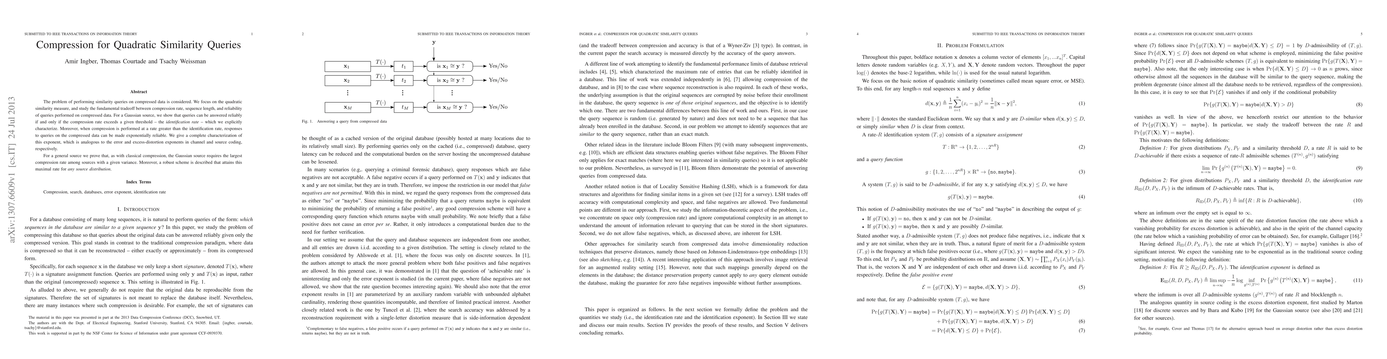 This paper investigates the trade-off between compression rate and reliability for similarity queries using quadratic similarity measures on compressed data. It demonstrates that for Gaussian sources, queries can be reliably answered if the compression rate exceeds a specific threshold, termed the identification rate.