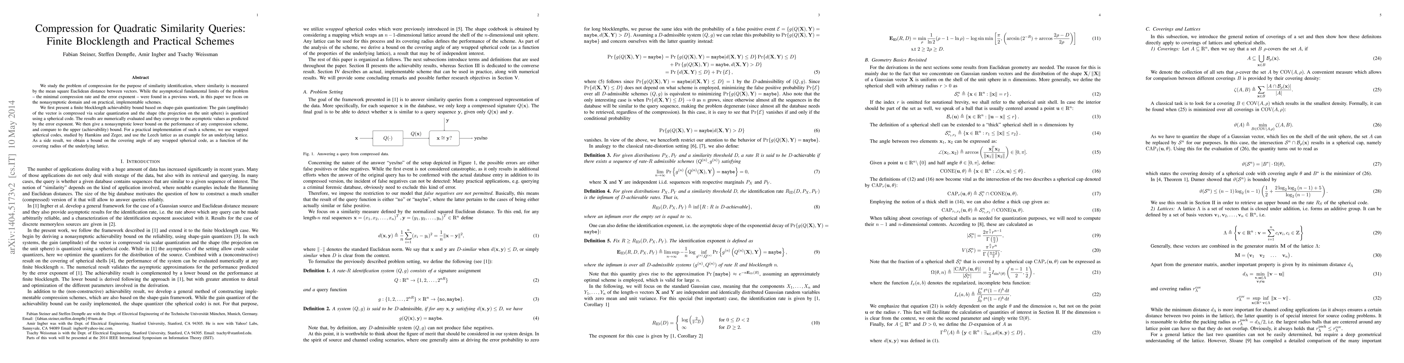 We study the problem of compression for the purpose of similarity identification, where similarity is measured by the mean square Euclidean distance between vectors. While the asymptotical fundamental limits of the problem - the minimal compression rate and the error exponent - were found in a previous work, in this paper we focus on the nonasymptotic domain and on practical, implementable schemes. We first present a finite blocklength achievability bound based on shape-gain quantization: The gain (amplitude) of the vector is compressed via scalar quantization and the shape (the projection on the unit sphere) is quantized using a spherical code. The results are numerically evaluated and they converge to the asymptotic values as predicted by the error exponent. We then give a nonasymptotic lower bound on the performance of any compression scheme, and compare to the upper (achievability) bound. For a practical implementation of such a scheme, we use wrapped spherical codes, studied by Hamkins and Zeger, and use the Leech lattice as an example for an underlying lattice. As a side result, we obtain a bound on the covering angle of any wrapped spherical code, as a function of the covering radius of the underlying lattice.
