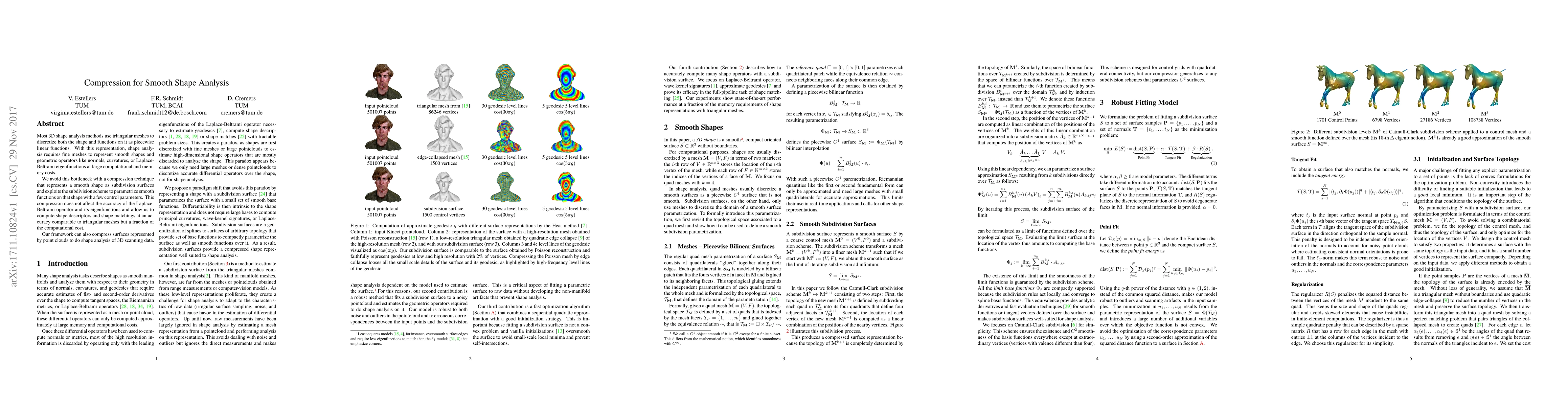 Researchers developed a compression technique to represent smooth 3D shapes using subdivision surfaces, reducing computational cost for shape analysis. This allows for accurate shape descriptors and matchings at a fraction of the cost of traditional triangular mesh representations.