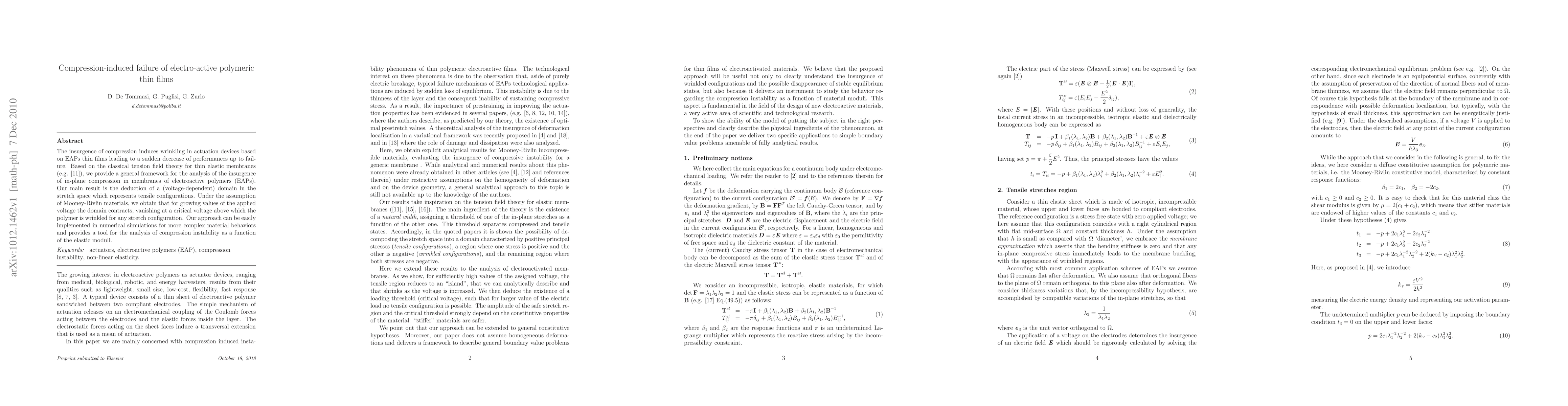 This paper develops a theoretical framework to analyze the compression-induced failure of electroactive polymeric (EAP) thin films, showing that increasing applied voltage reduces the domain of stable tensile configurations until failure occurs due to wrinkling. The model, based on the Mooney-Rivlin material assumption, can be applied to simulate and predict compression instability in various EAP materials.