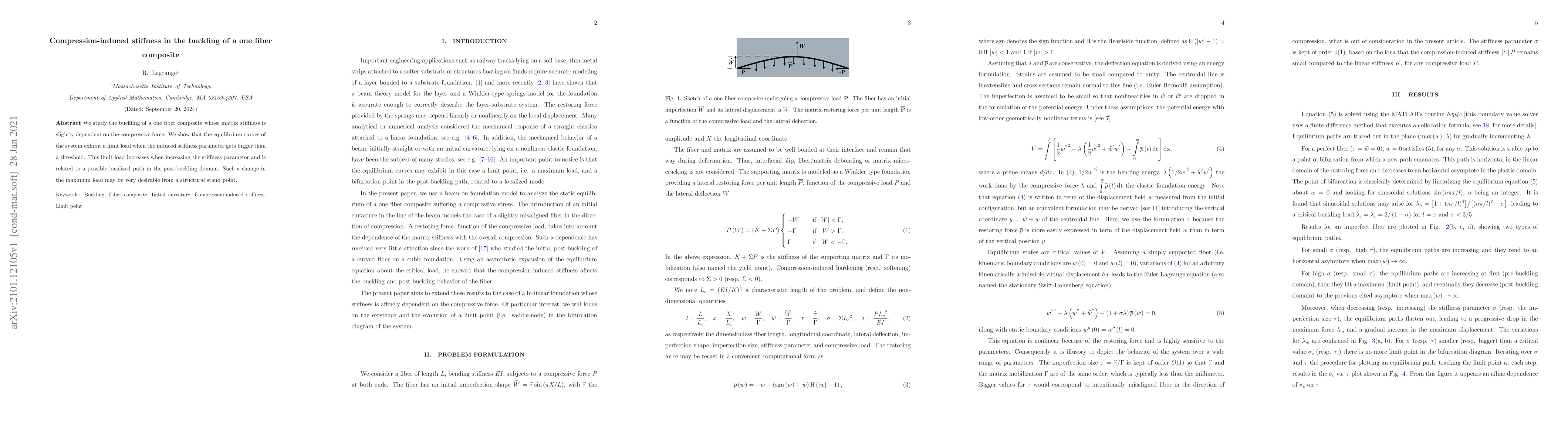 We study the buckling of a one fiber composite whose matrix stiffness is slightly dependent on the compressive force. We show that the equilibrium curves of the system exhibit a limit load when the induced stiffness parameter gets bigger than a threshold. This limit load increases when increasing the stiffness parameter and is related to a possible localized path in the post-buckling domain. Such a change in the maximum load may be very desirable from a structural stand point.