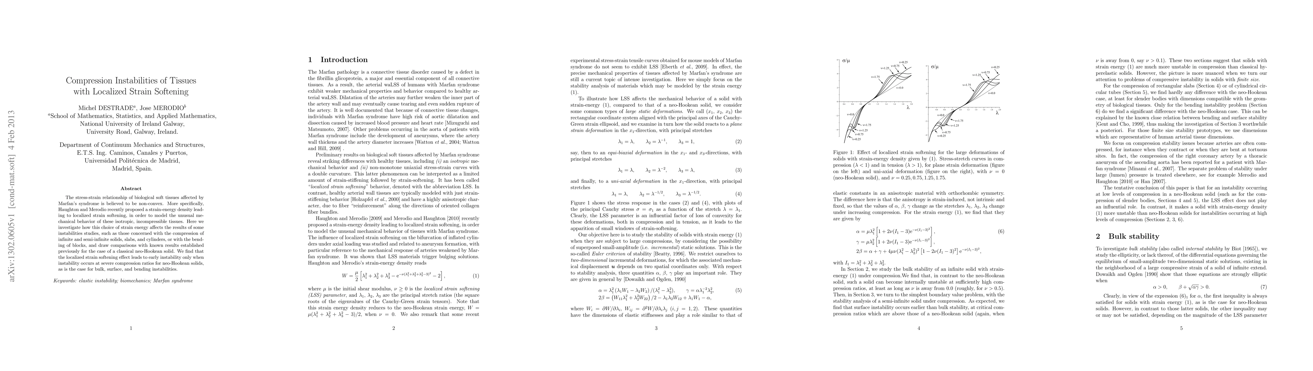 This paper examines the impact of localized strain softening on the compression instabilities of soft tissues, particularly those affected by Marfan's syndrome, and finds that such softening leads to early instability under severe compression conditions, contrasting with the behavior of classical neo-Hookean solids.
