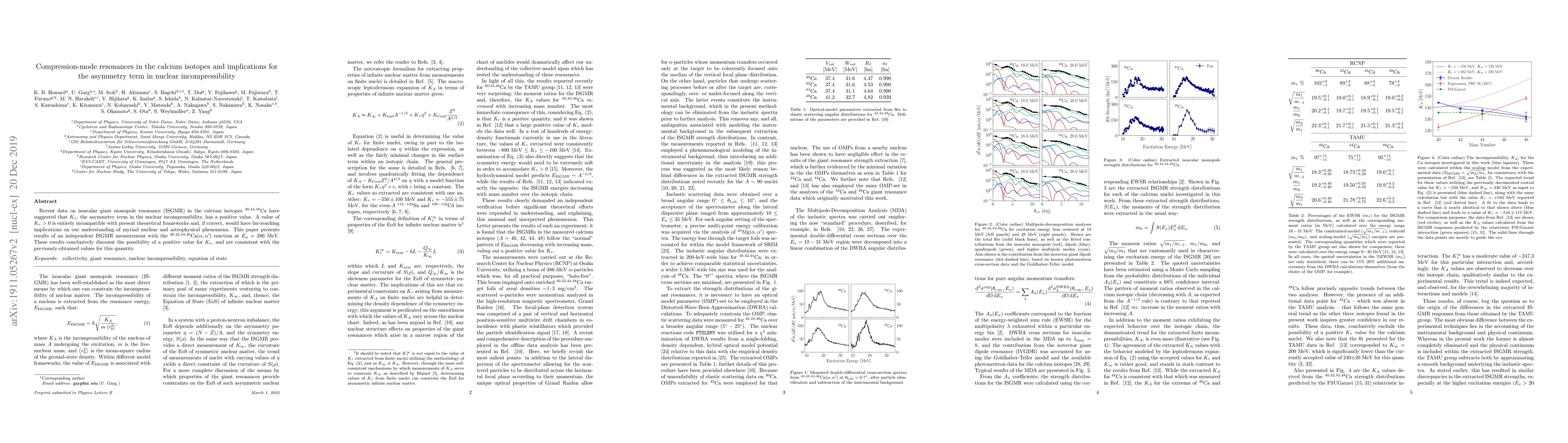 This paper reports new measurements of the isoscalar giant monopole resonance in calcium isotopes, concluding that the asymmetry term in nuclear incompressibility, $K_\tau$, is not positive, thus aligning with existing theoretical frameworks and maintaining consistency with previous results.