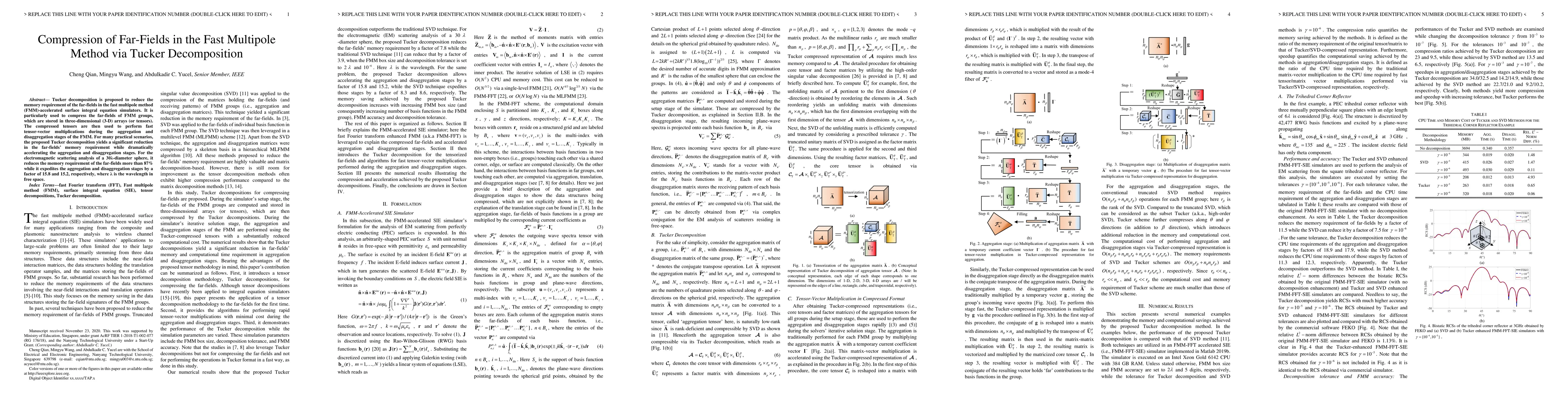 This paper proposes using Tucker decomposition to compress the far-fields in fast multipole method (FMM) simulations, significantly reducing memory requirements and accelerating aggregation and disaggregation stages. For a 30{\lambda}-diameter sphere, it achieves over 87% memory reduction and a 15.8-fold speedup in aggregation.