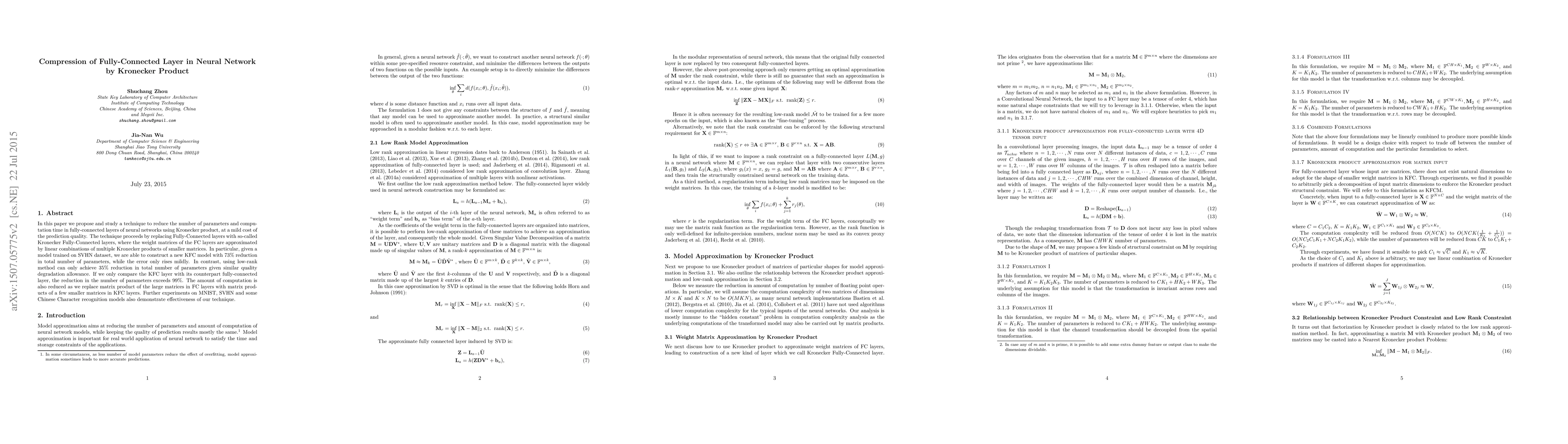 Researchers propose a technique to reduce parameters and computation time in fully-connected layers using Kronecker product, achieving 73% parameter reduction while maintaining minimal degradation in prediction quality.