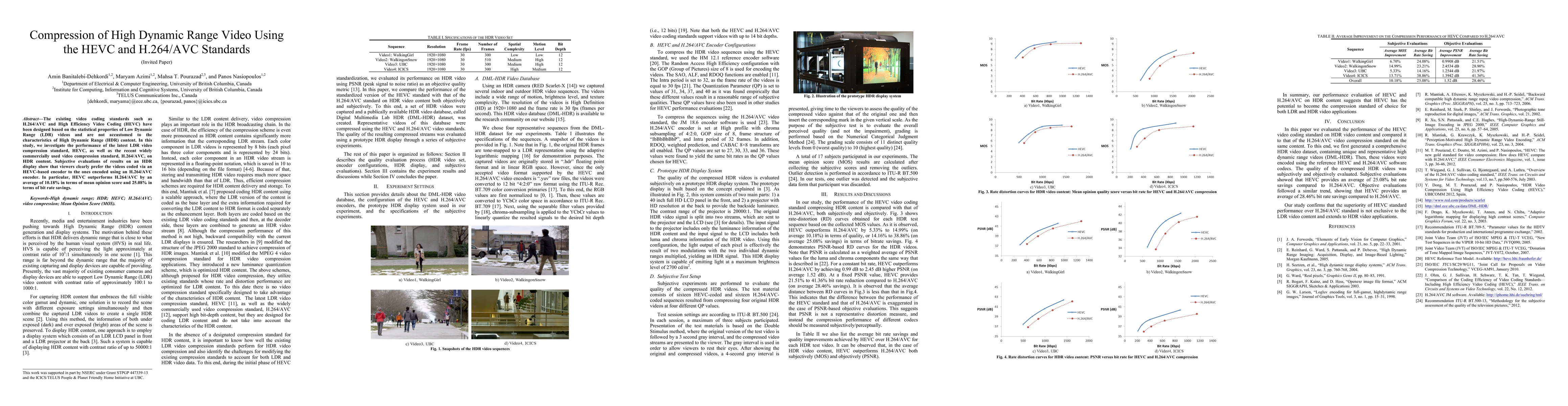 This study evaluates the performance of H.264/AVC and HEVC standards for compressing High Dynamic Range (HDR) video content. Results show that HEVC provides better subjective quality and achieves significant bit rate savings compared to H.264/AVC, with an average improvement of 10.18% in mean opinion score and 25.08% in bit rate.